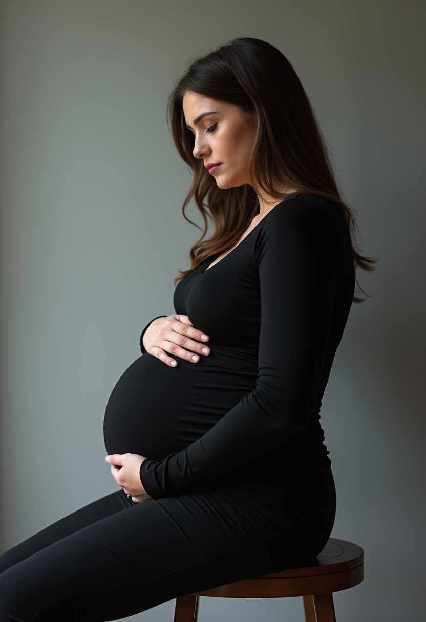 Беременная женщина с большим округлым животом в чёрном облегающем платье с длинными рукавами сидит на высоком стуле у серой стены. Её руки нежно обхватывают живот, взгляд направлен вниз. Освещение мягкое, рассеянное, создающее лёгкие тени на фоне. Кадр крупный, акцент на её силуэте и форме живота.