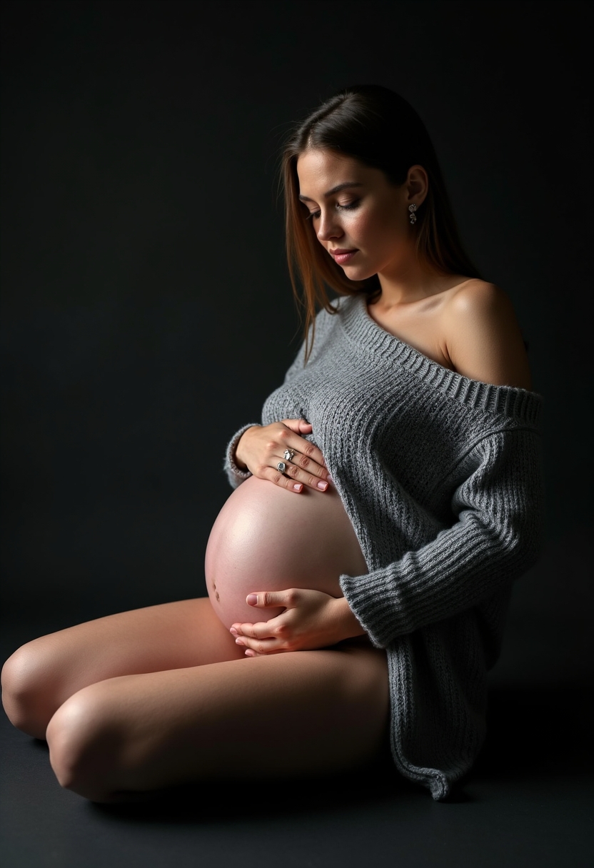 Беременная женщина с большим животом в сером вязаном свитере, спадающем с одного плеча, сидит на полу у чёрного фона. Её колени согнуты, руки бережно держат живот. Освещение контрастное, направленный боковой свет подчёркивает текстуру ткани и плавные линии тела. Кадр крупный, акцент на форме живота.