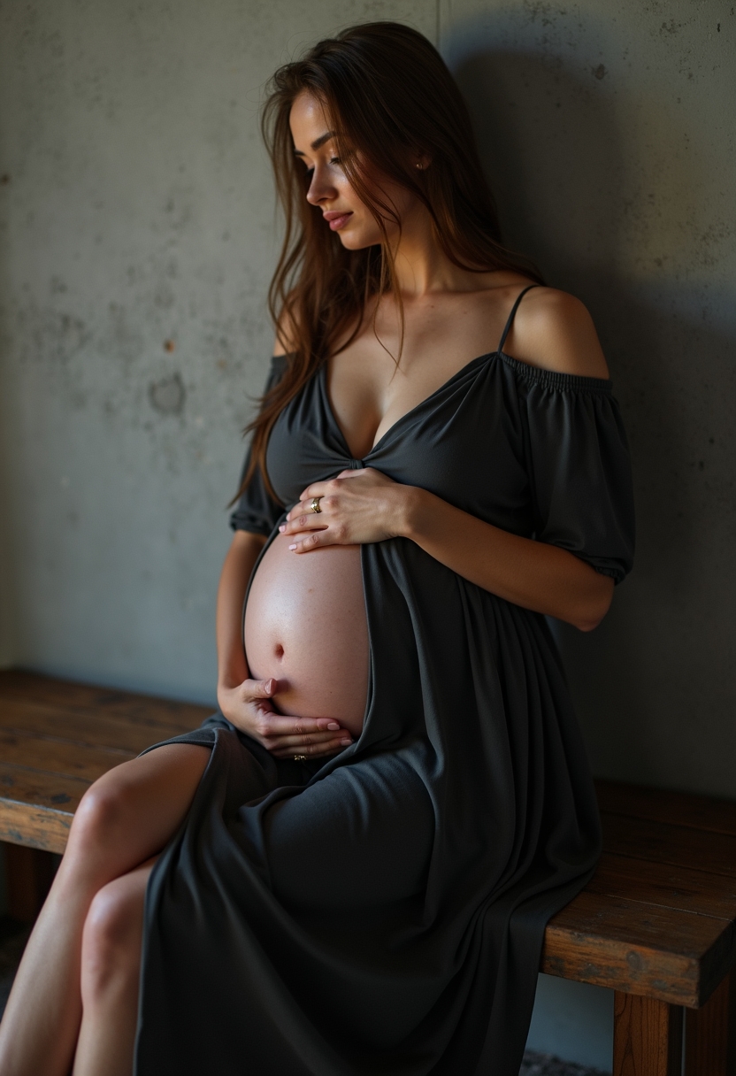 Беременная женщина с округлым животом в тёмно-сером струящемся платье с разрезом сидит на низкой деревянной скамье у бетонной стены. Её одна рука держит живот, другая касается подбородка. Освещение точечное, с узким лучом света, создающим атмосферу уединения. Кадр крупный, живот подчёркнут игрой света и тени.