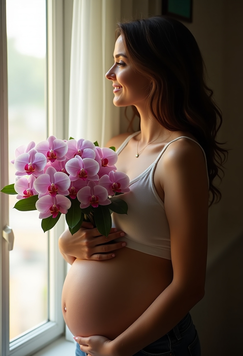 Примерить образ на себеБеременная женщина с распущенными волосами, смотрит в окно, держа большой букет орхидей, улыбается, свет из окна создает игру теней на её лице