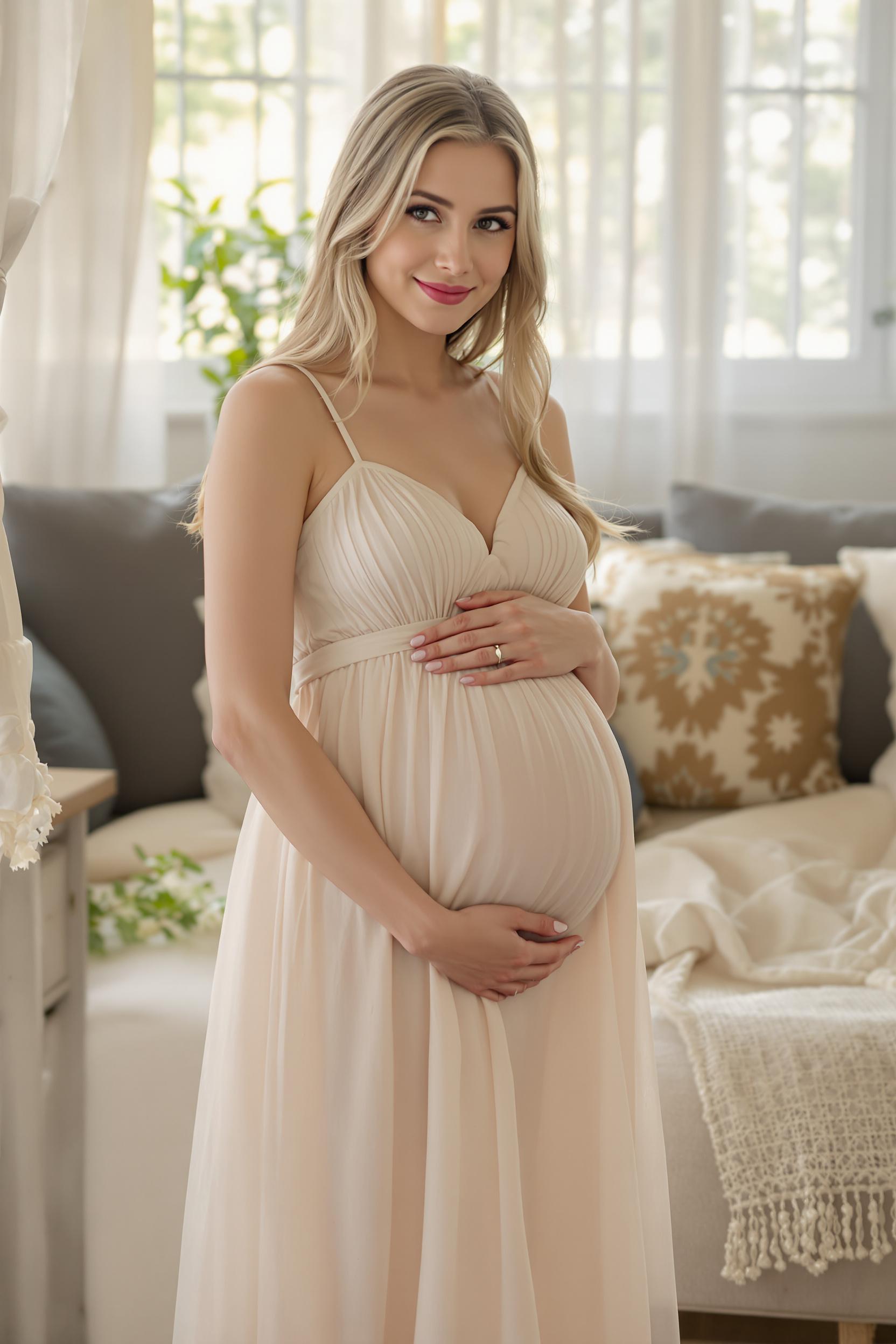Беременная женщина в нежном длинном платье, держит руки на животе, мягкий естественный свет, утончённая атмосфера уюта, смотрит прямо в камеру, спокойная улыбка.