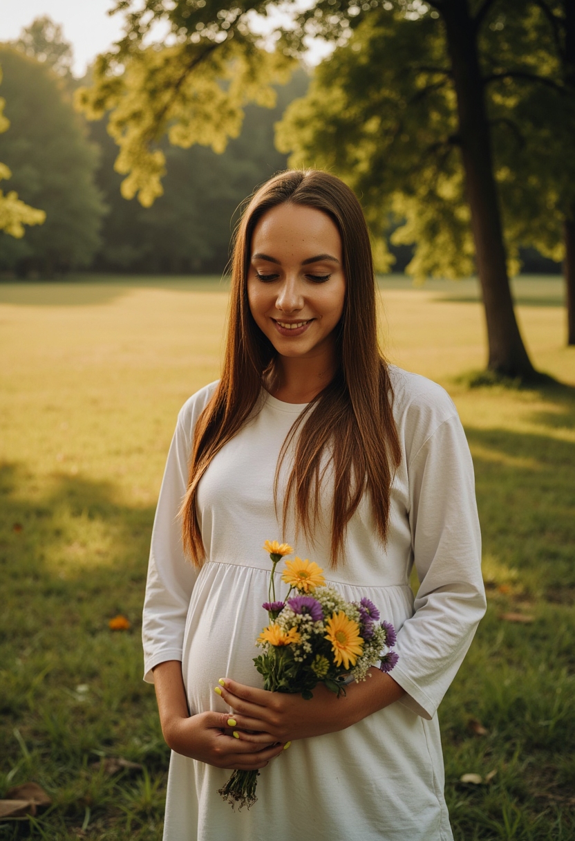 Беременная женщина в парк, окруженная деревьями, держит в руках букет полевых цветов, стоя на солнце и с улыбкой, ловящей момент счастья