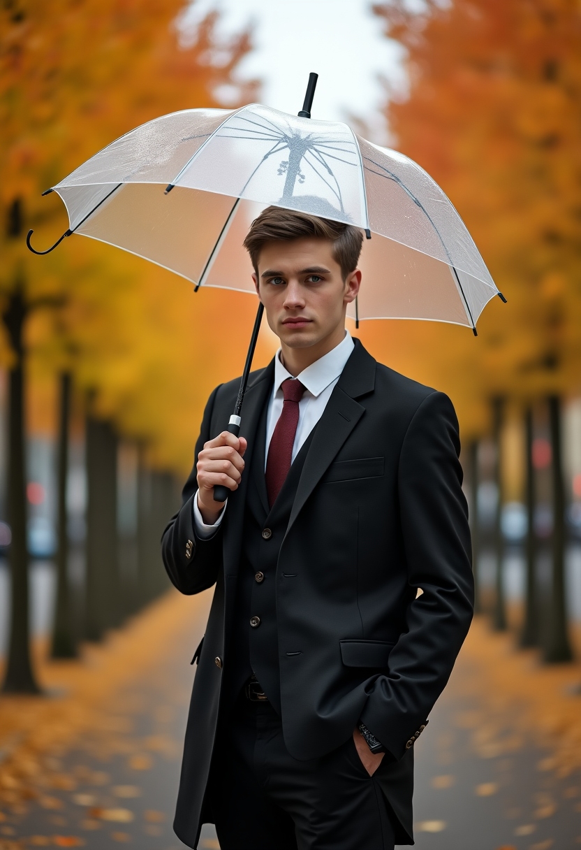 Человек держит зонтик с прозрачным куполом, стоит на фоне аллеи с осенними деревьями