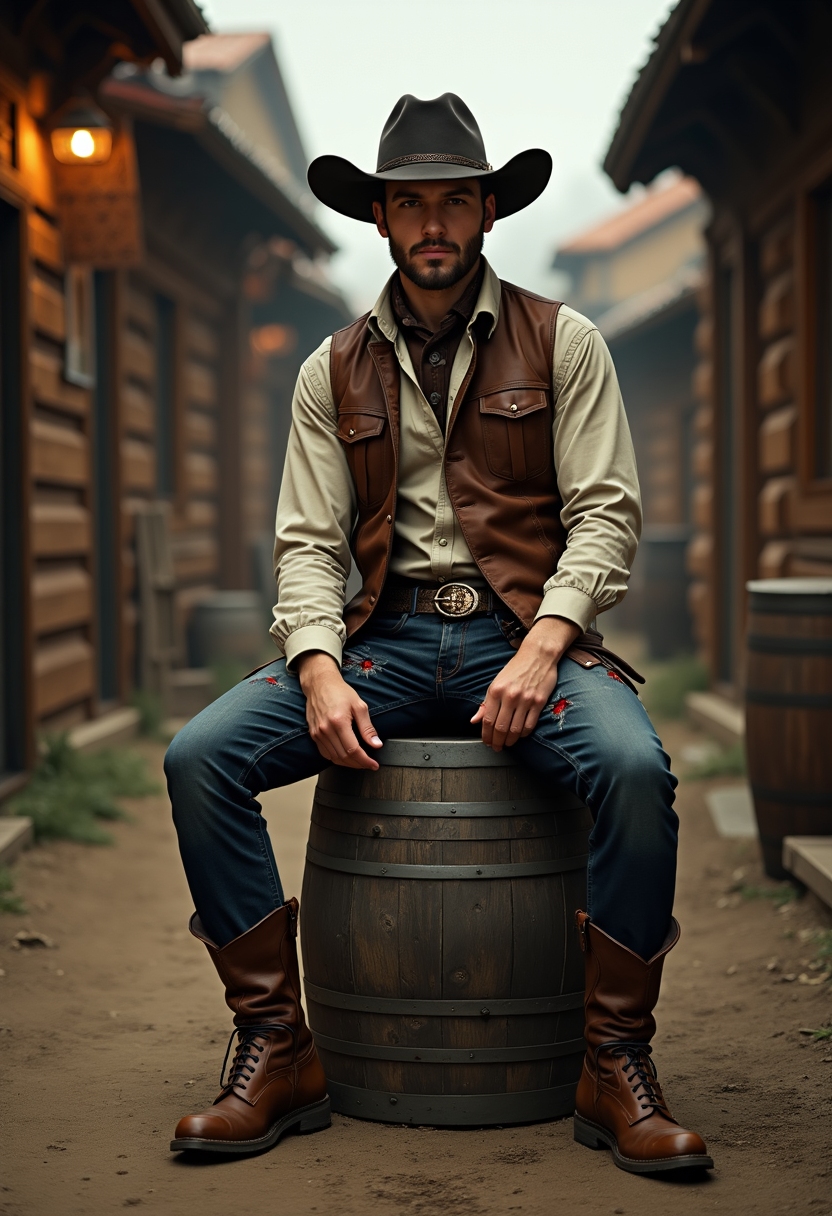 Человек в сапогах со шпорами сидит на бочке перед баром, смотрит прямо в камеру, вокруг деревянные здания