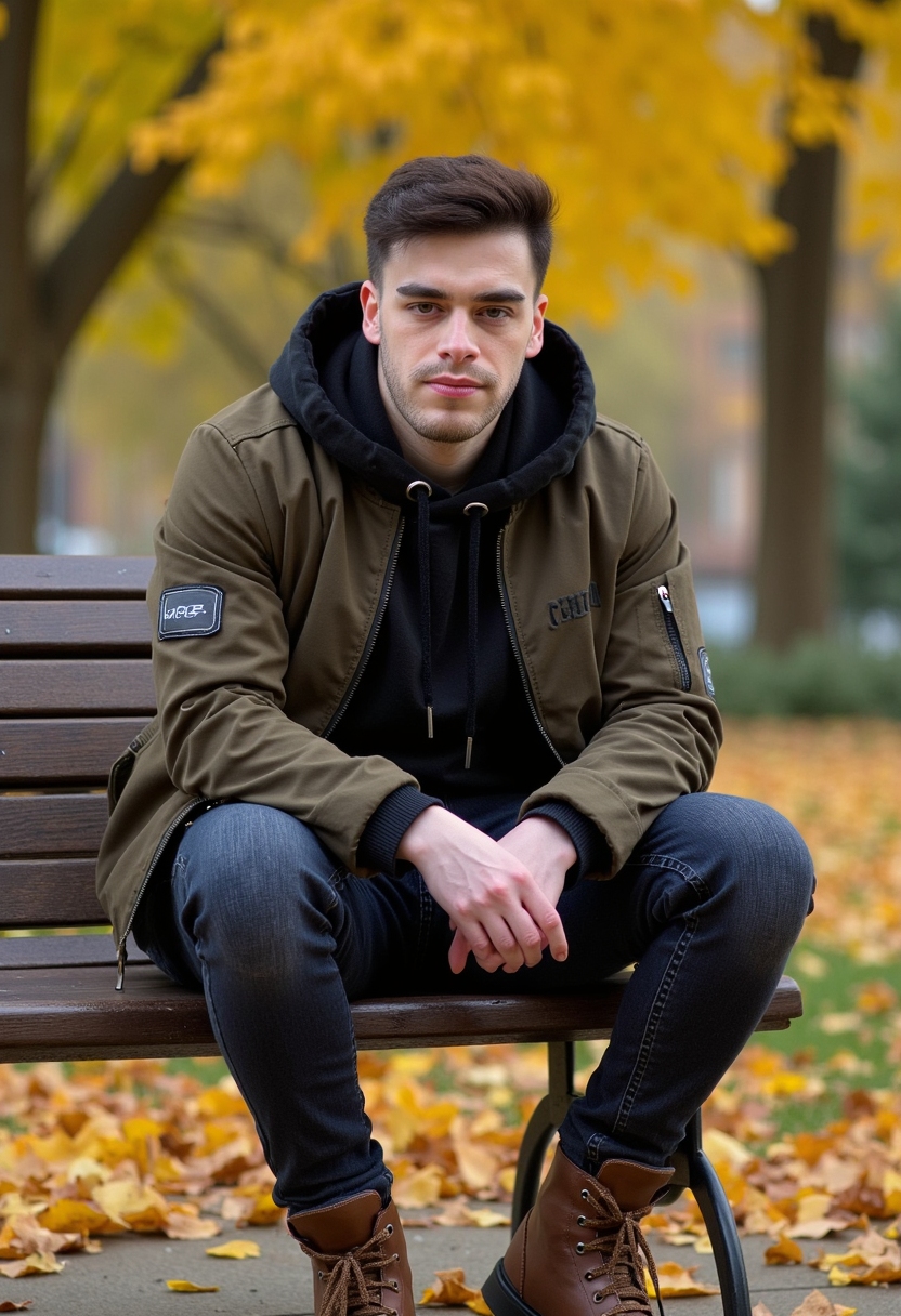 Человек в тёплой одежде сидит на лавочке в осеннем парке, вокруг листья и деревья