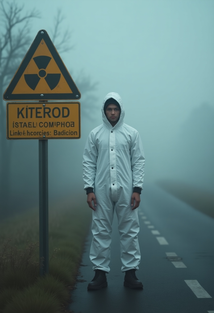 Человек в защитной одежде стоит у знака радиационной опасности, прямо смотрит в камеру, густой туман вокруг