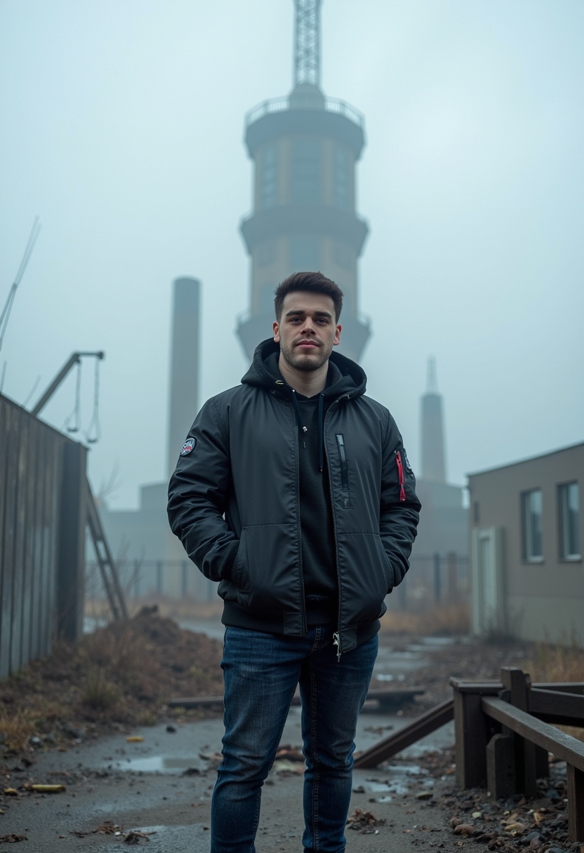 Человек в зимней куртке стоит у обрушенной башни, вокруг густой туман и фрагменты техники, смотрит прямо в камеру