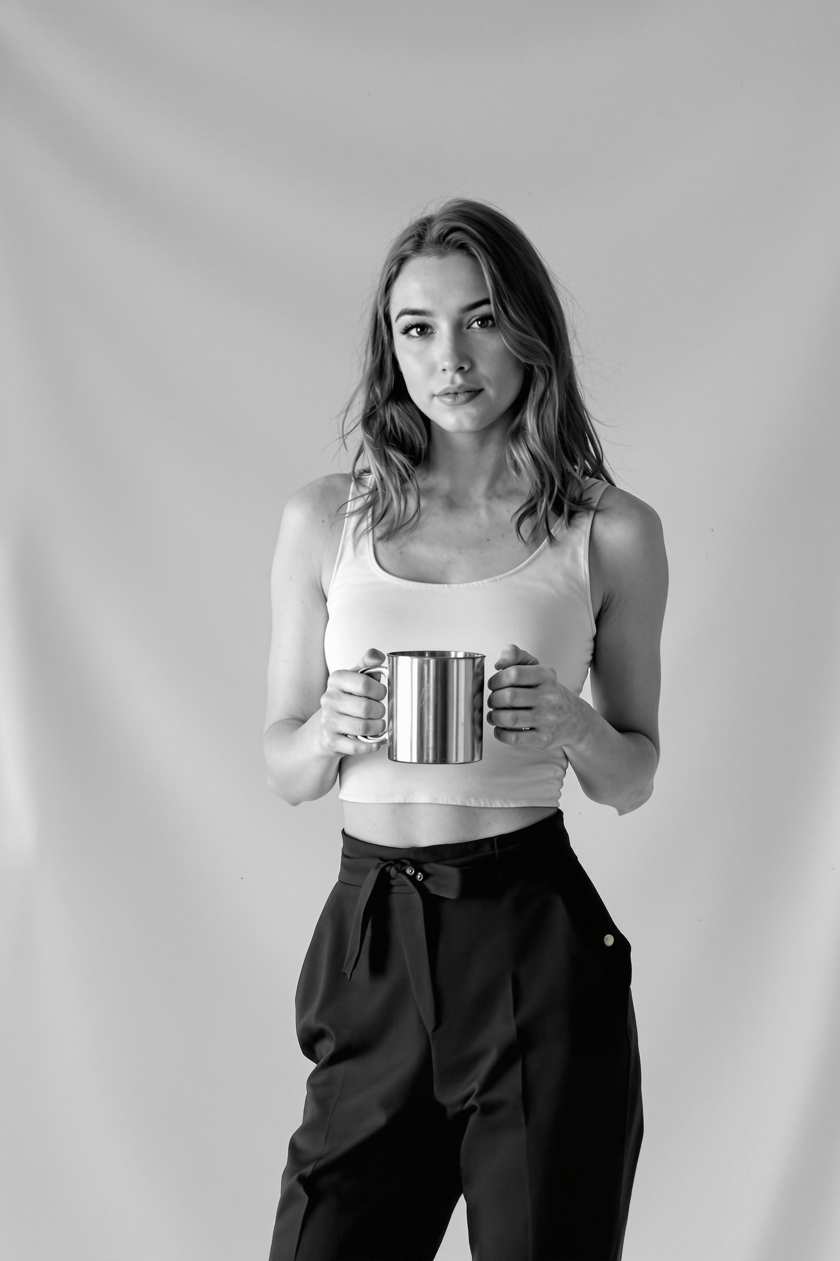 Черно-белая фотография молодой женщины в лаконичном топе и строгих брюках, в руках металлическая кружка, стоит перед белой циклорамой, смотрит в камеру, мягкий свет подчеркивает минималистичную обстановку и естественную позу.