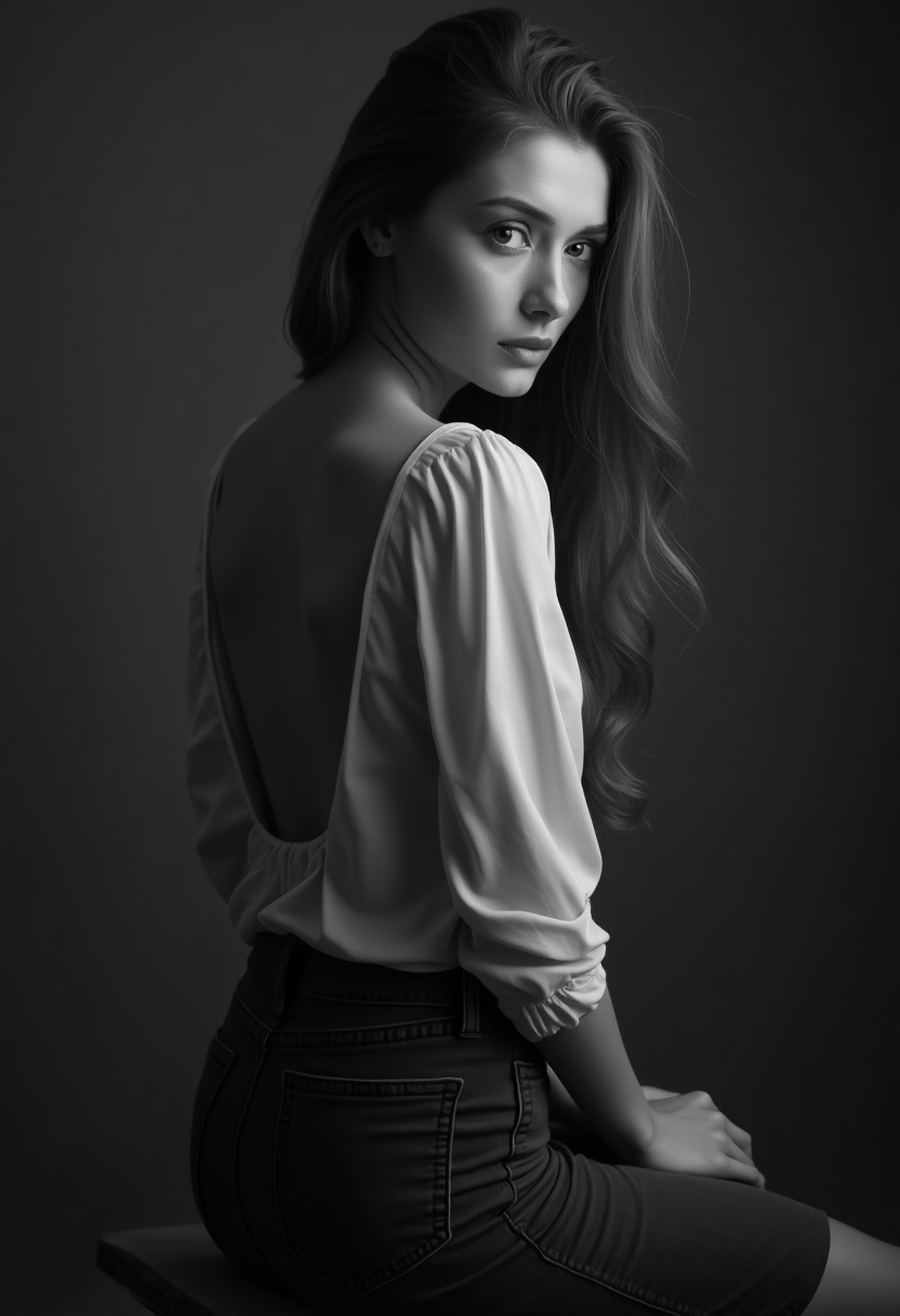 Черно-белая фотография женщины в блузке с открытой спиной сидит на краю стола, смотрит через плечо в камеру, свет выделяет линию плеч