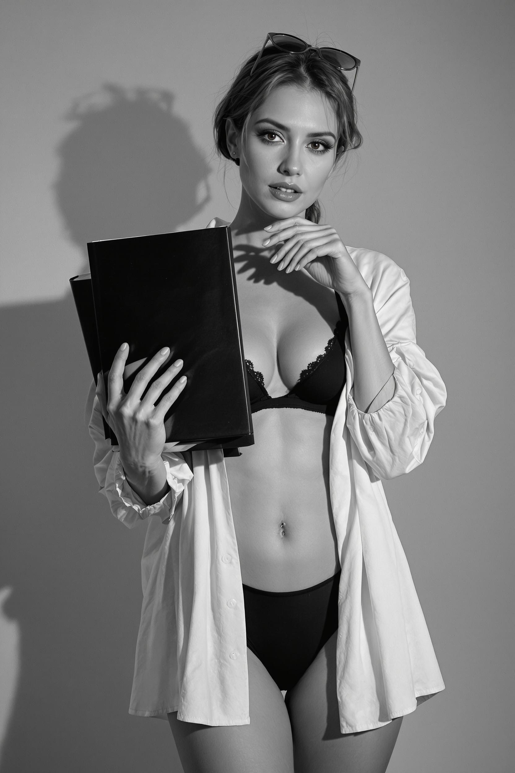 Примерить образ на себеЧерно-белая фотография женщины в лаконичном бельевом комплекте и оверсайз рубашке, она стоит на фоне циклорамы, держит в одной руке большую черно-белую книгу, другой касается подбородка, уверенный прямой взгляд в камеру, геометрия света и тени.