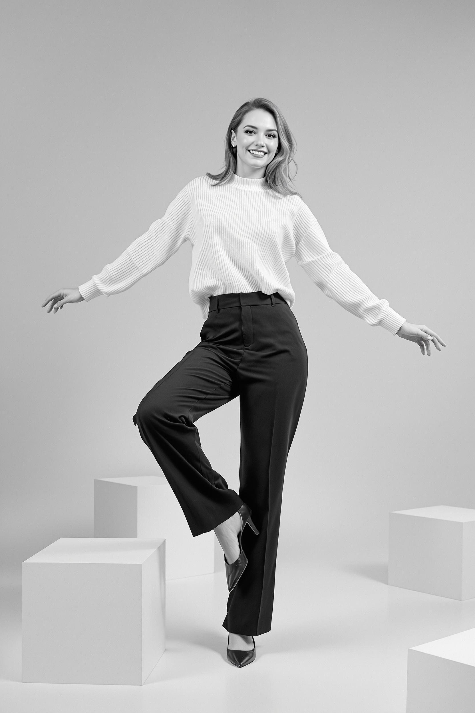 Черно-белая фотография женщины в лаконичном джемпере и прямых брюках, она стоит на одной ноге, вторую чуть сгибает, руки раскинуты в стороны, вокруг расставлены минималистичные кубы, смотрит в камеру с легкой улыбкой, мягкий свет.