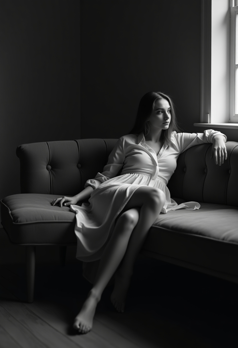 Черно-белая фотография женщины в платье с длинными рукавами лежит на диване, опираясь на одну руку, смотрит прямо в камеру, студийный свет создает мягкие тени