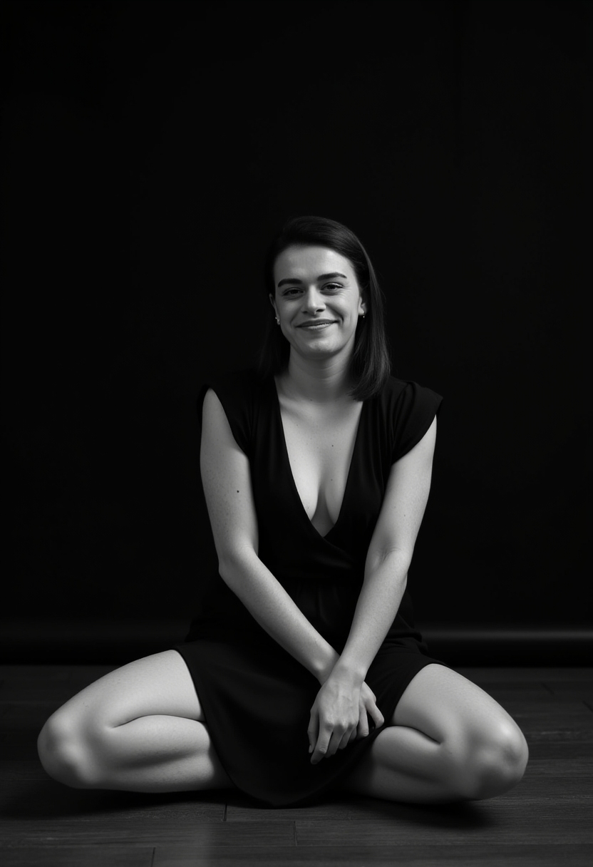 Черно-белая фотография женщины в платье с глубоким вырезом сидит на подушке на полу, мягко улыбается в камеру, фон равномерно затемнён