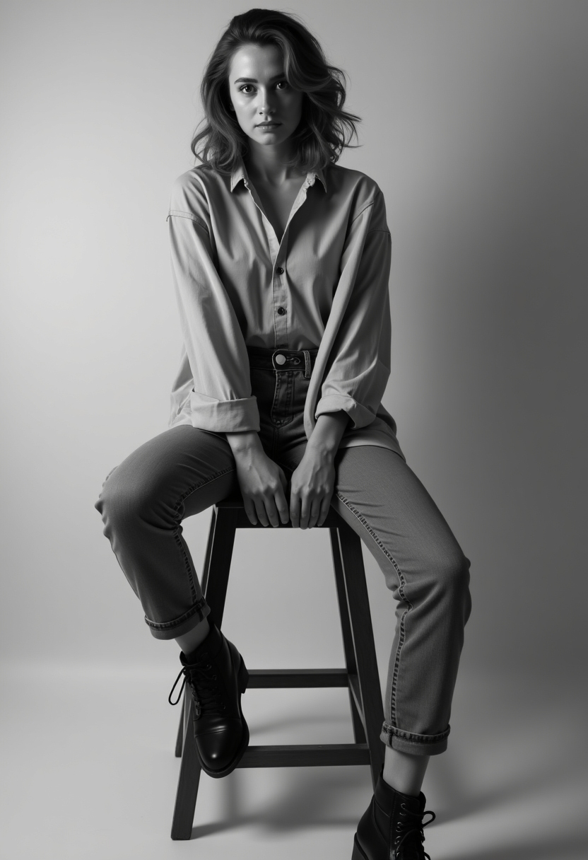 Черно-белая фотография женщины в свободной рубашке и джинсах сидит на деревянной табуретке, смотрит прямо в камеру