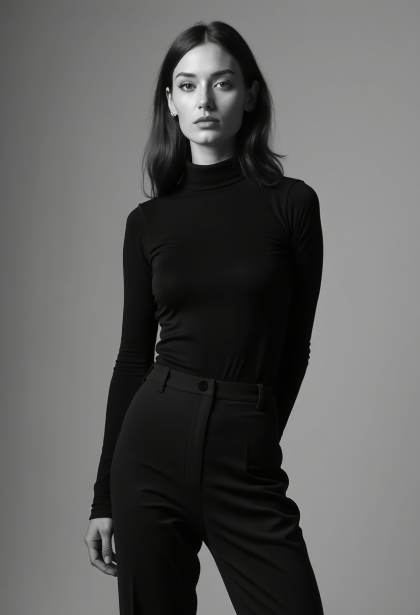 Черно-белая фотография женщины в тёмной водолазке и классических брюках стоит с опущенными руками, смотрит в камеру с задумчивым выражением, фон мягкий серый