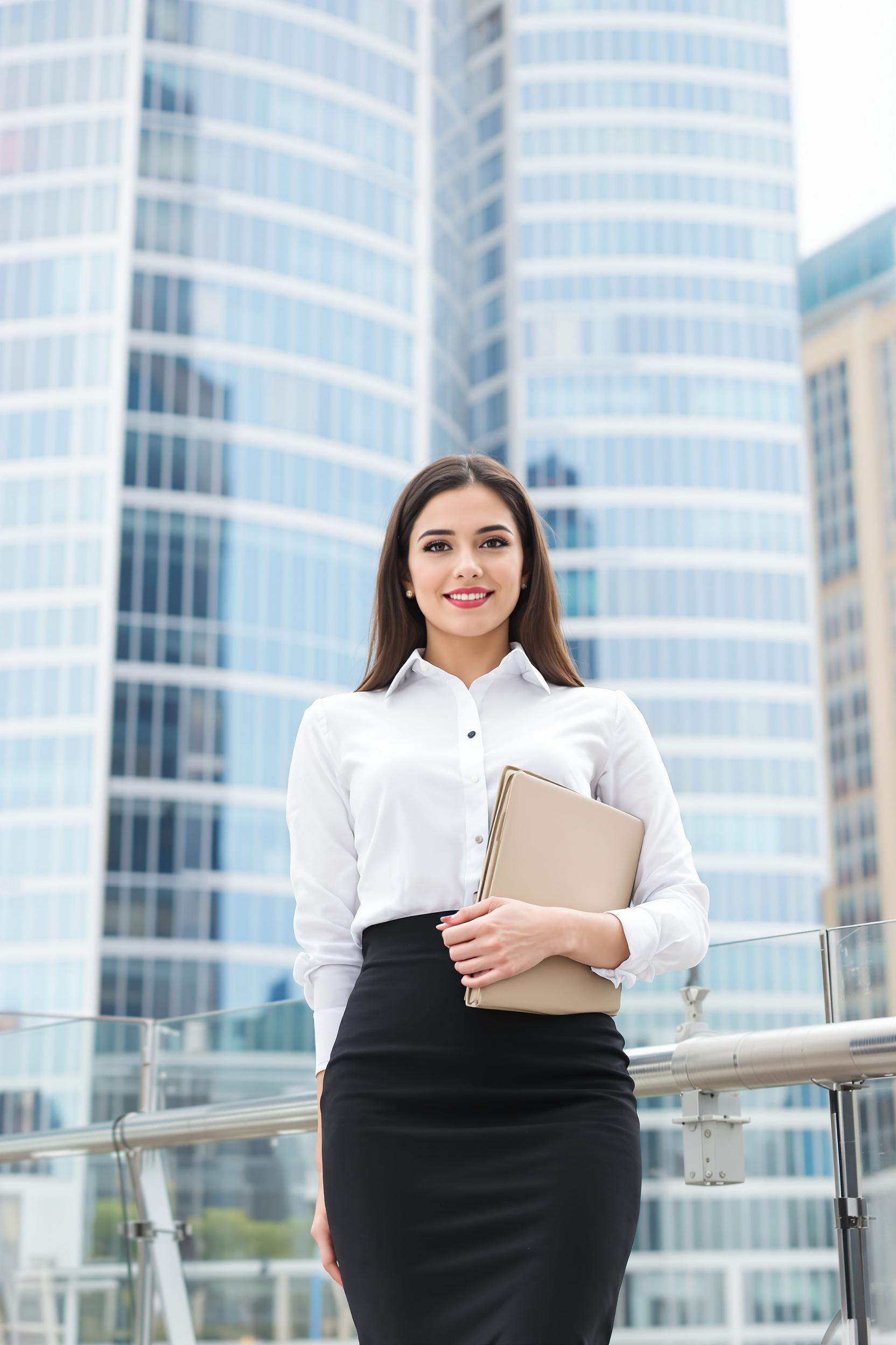 Деловая женщина в классической белой рубашке и темной юбке-карандаш, средний план, стоит на открытой площадке среди башен Москва-Сити, с папкой в руках и уверенным взглядом смотрит прямо в камеру, за спиной современные офисные здания мегаполиса.