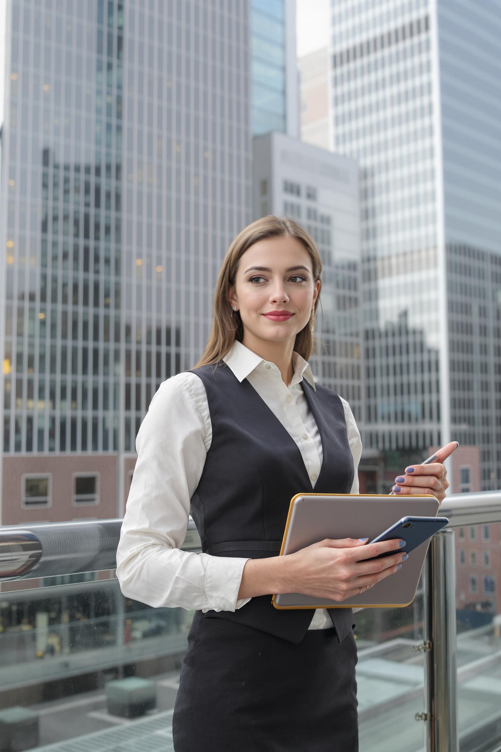 Деловая женщина в элегантной жилетке и легкой светлой рубашке, средний план, стоит на фоне современных российских бизнес-центров, держит ноутбук и смартфон, уверенно смотрит в камеру, вокруг городская архитектура мегаполиса.
