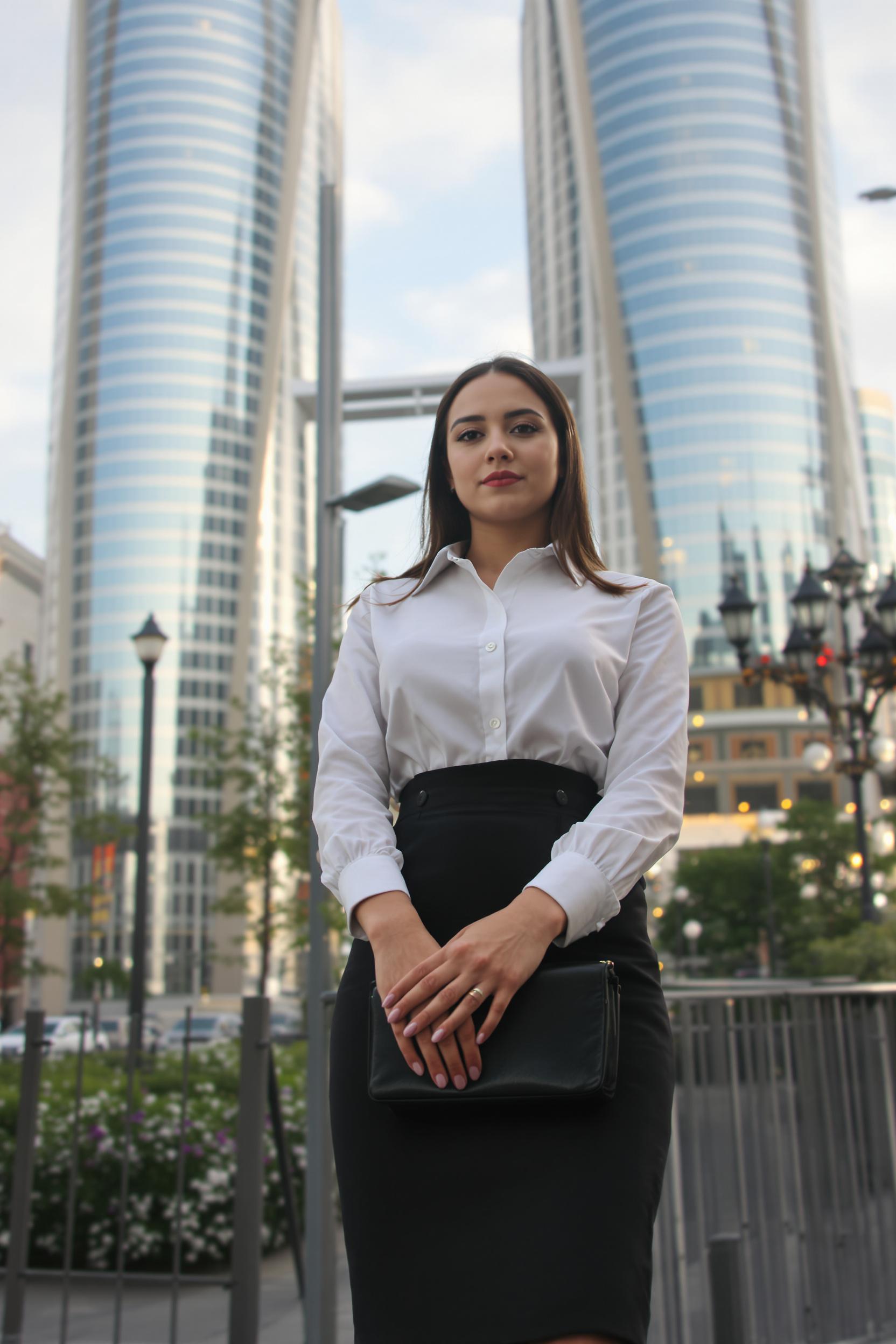 Деловая женщина в белой рубашке и строгой черной юбке-карандаш, средний план, стоит на фоне стеклянных высоток бизнес-центра Белая Площадь, папка в одной руке, уверенно смотрит прямо в камеру, за спиной современная архитектура мегаполиса.