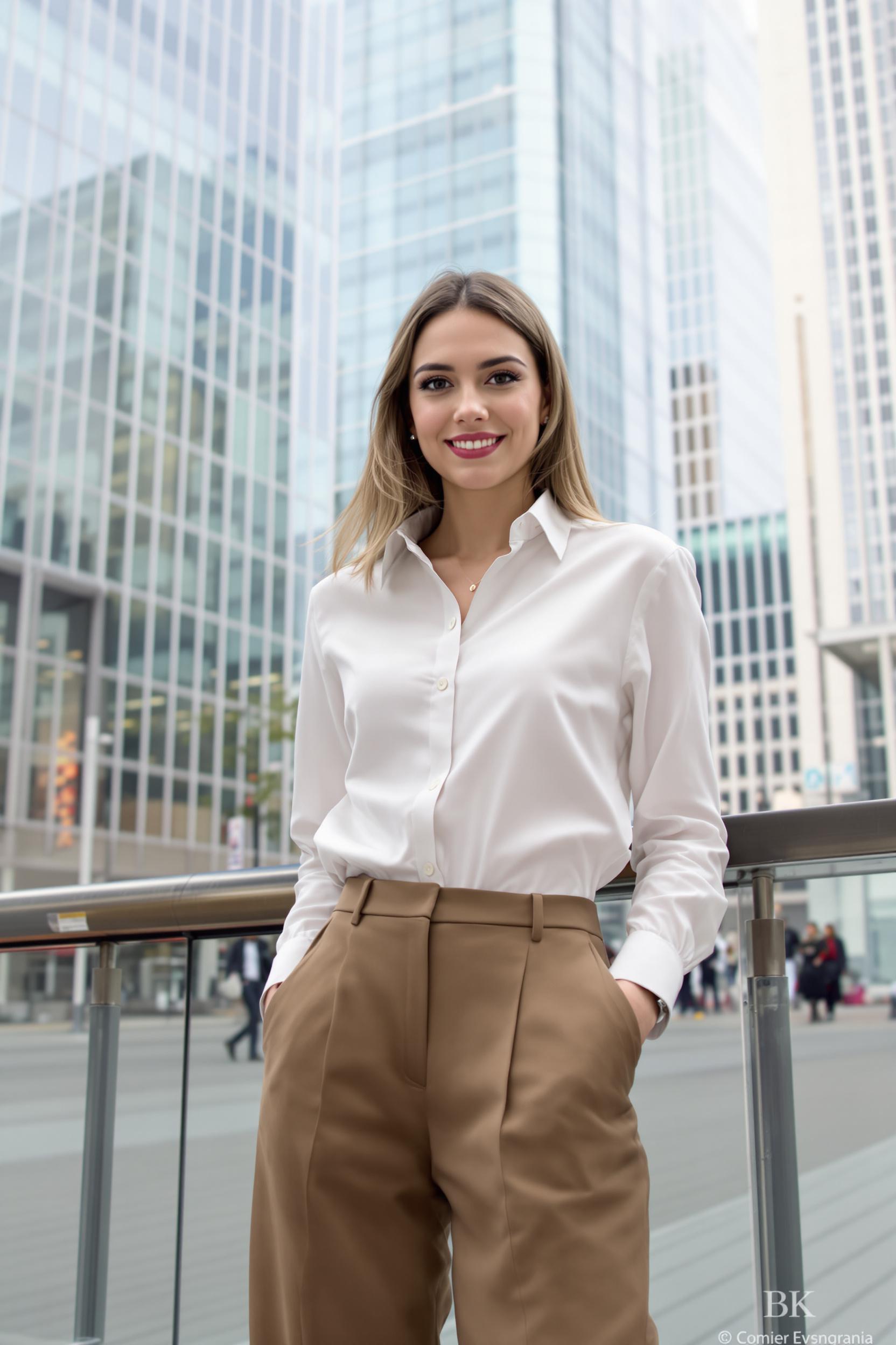 Примерить образ на себеДеловая женщина в светлой рубашке и широких тёмно-бежевых брюках, средний план, стоит на фоне стеклянных офисных зданий Белая Площадь, смотрит прямо в камеру с легкой улыбкой, расслабленная поза, городской деловой стиль, чувствуется энергия мегаполиса.