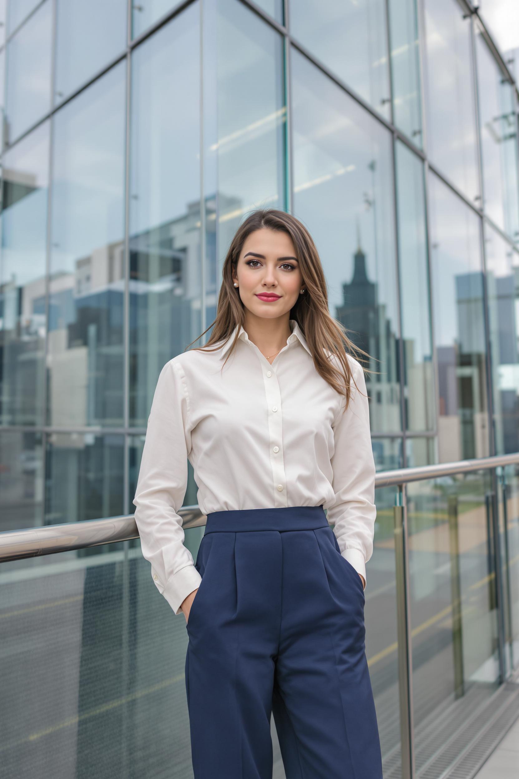 Деловая женщина в светлой рубашке с широкими темно-синими брюками, средний план, стоит возле стеклянного фасада бизнес-центра Москва-Сити, слегка наклонилась вперед, руки в боках, уверенно смотрит прямо в камеру, динамичный городской фон мегаполиса.