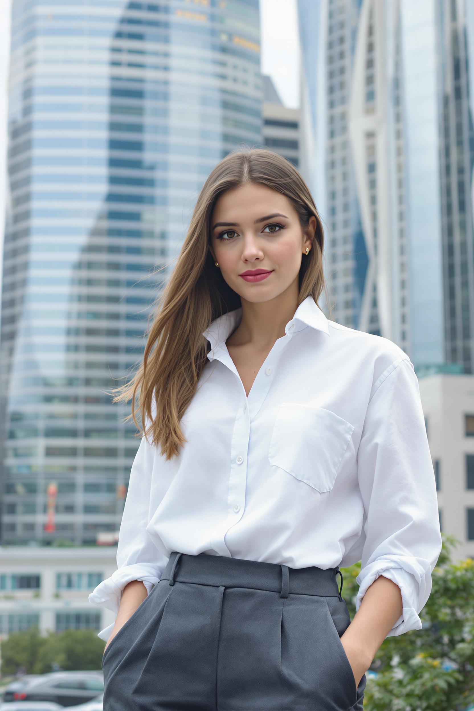 Деловая женщина в свободной белой рубашке и тёмно-серых широких брюках, средний план, стоит на фоне современных башен Москва-Сити, руки в карманах, уверенный прямой взгляд в камеру, выражение лица собранное, вокруг оживленный мегаполис.