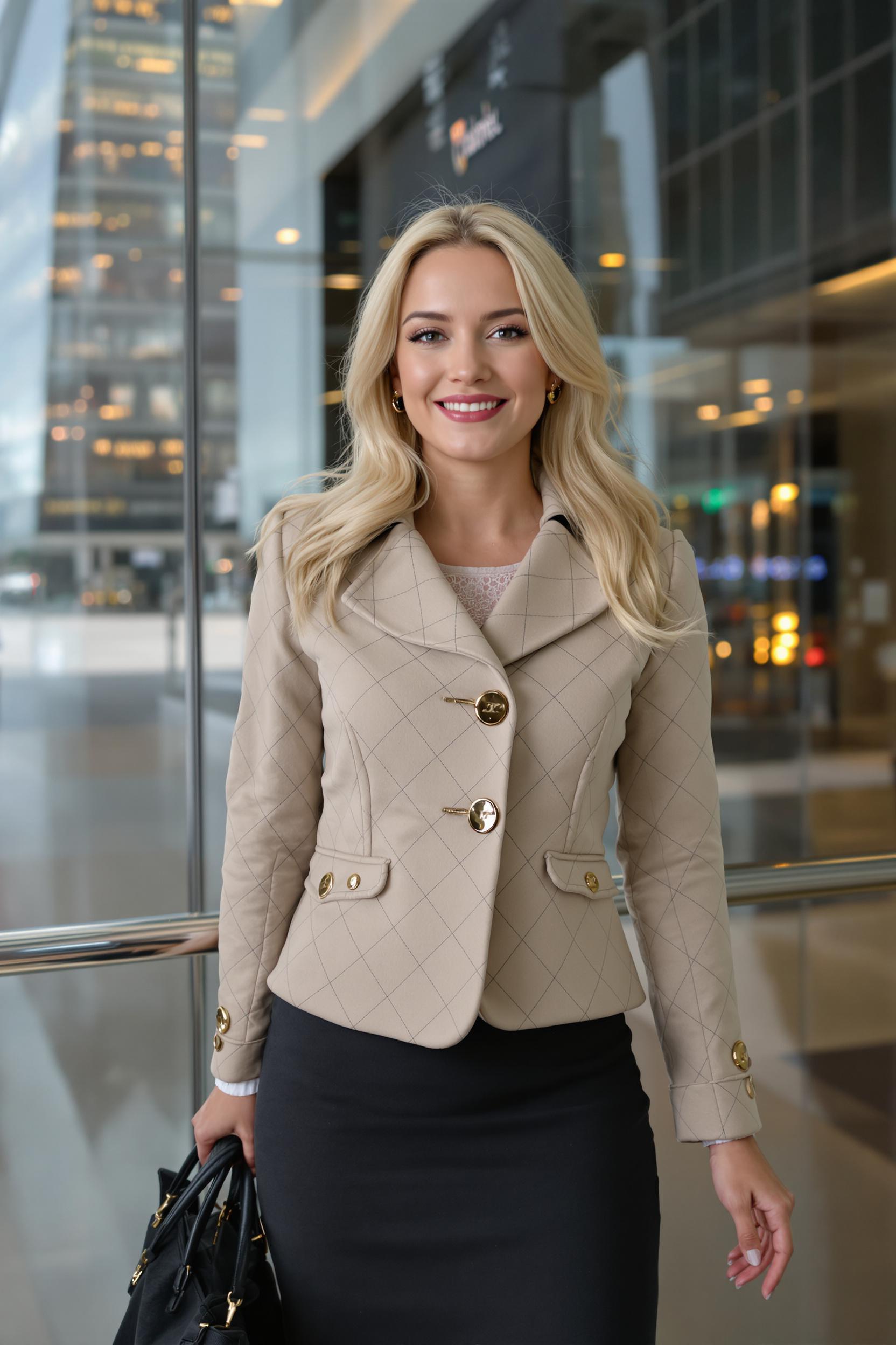 Деловая женщина в жакете в стиле шанель и классической юбке, средний план, стоит на фоне Лахта Центра, смотрит прямо в камеру с уверенной улыбкой, светлые волосы аккуратно уложены, вокруг отражения сияющих стеклянных фасадов большого города.