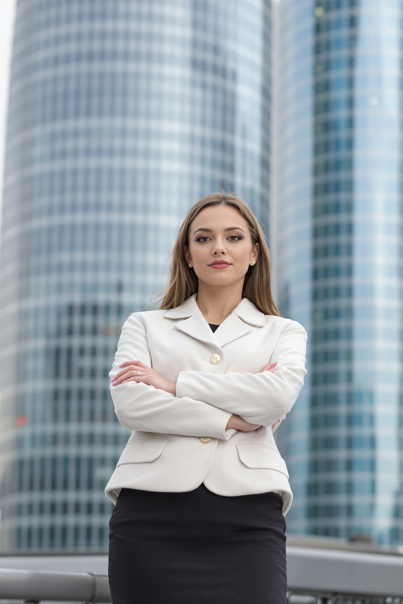 Деловая женщина в классической белой рубашке и темной юбке-карандаш, средний план, стоит на открытой площадке среди башен Москва-Сити, с папкой в руках и уверенным взглядом смотрит прямо в камеру, за спиной современные офисные здания мегаполиса.
