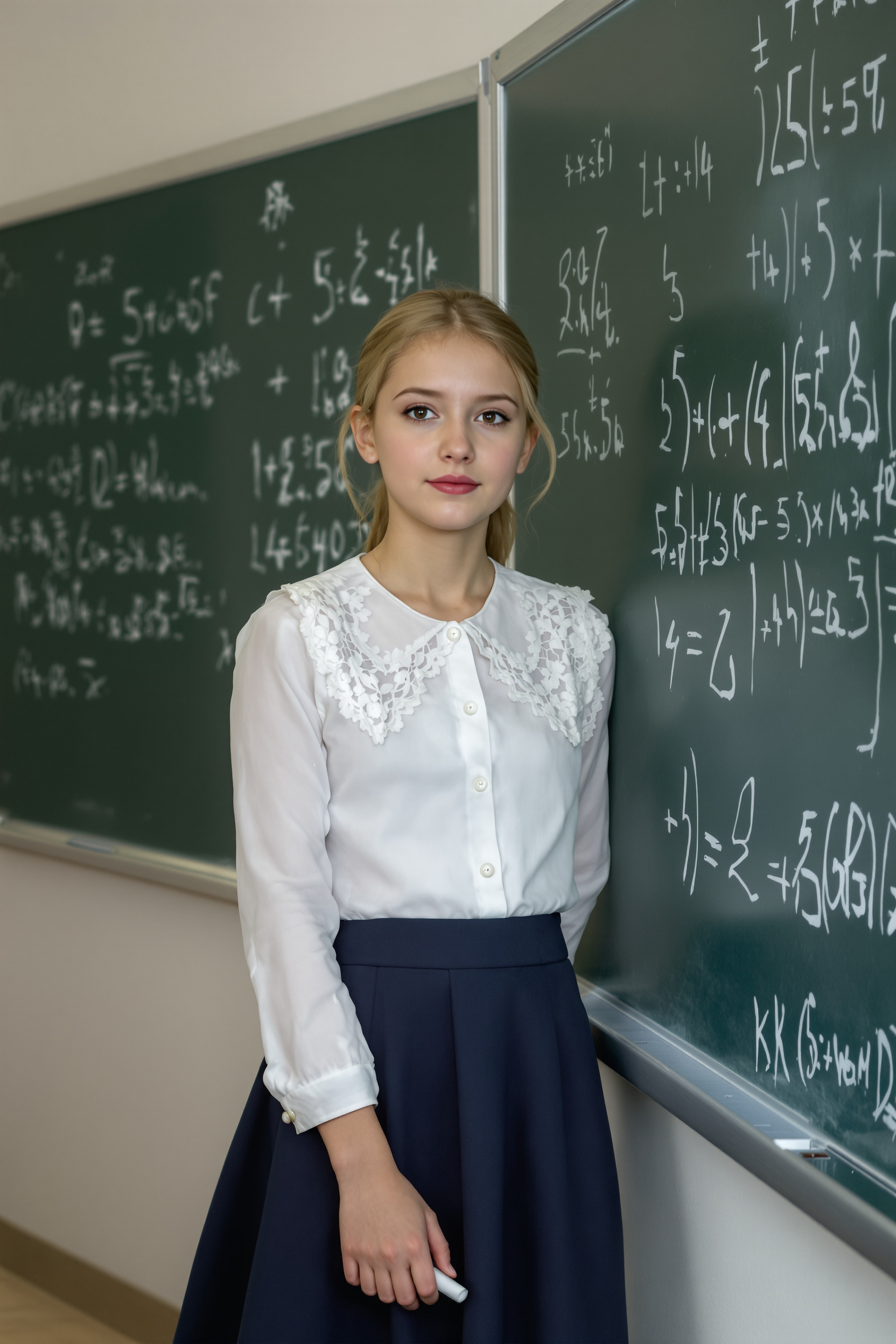 Девочка в белой блузке с кружевным воротником и темно-синей юбке стоит у школьной доски, держит мел, смотрит прямо в камеру, вокруг минимальный интерьер класса, на доске записаны формулы.