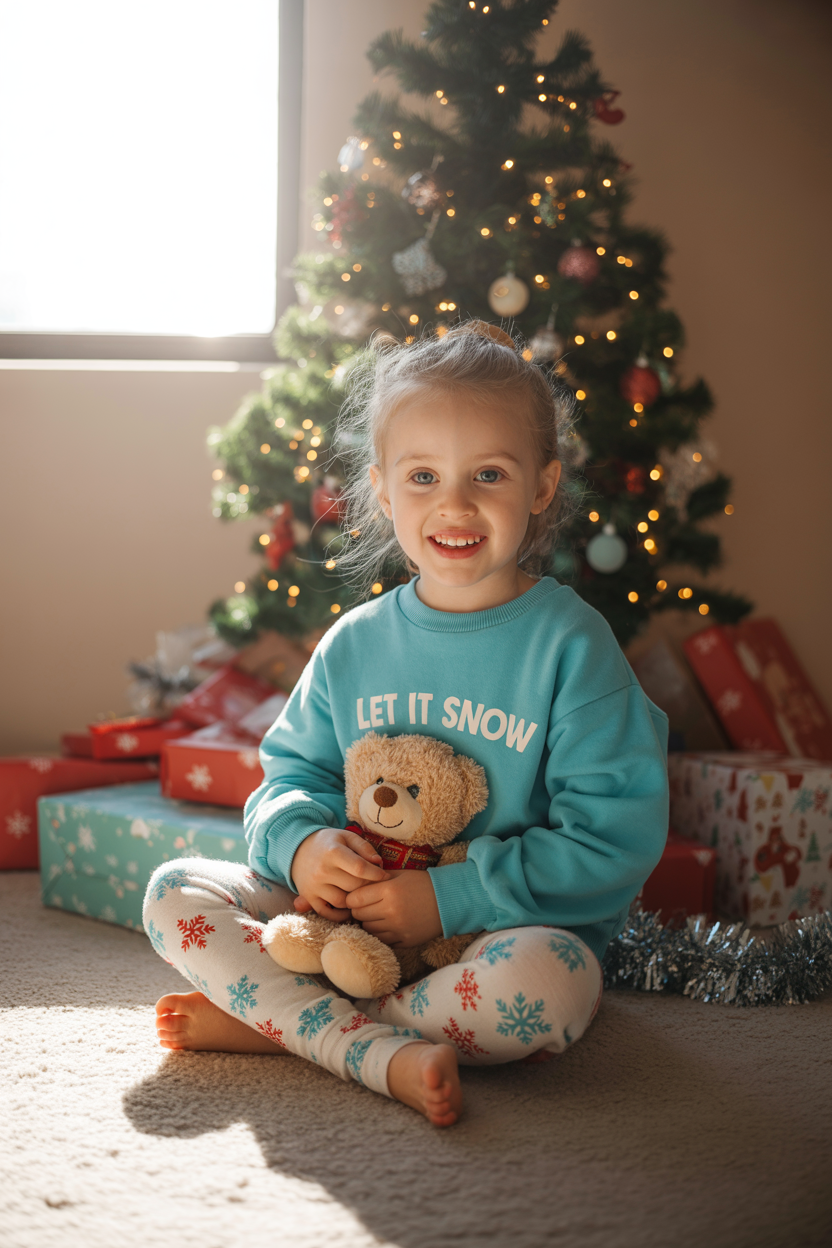 Девочка в детской комнате с наряженной елкой, одета в мягкий бирюзовый свитшот с изображением снеговика, леггинсы с узором снежинок и пушистые тапочки. Она сидит на ковре, скрестив ноги, обнимает новогоднего плюшевого мишку, улыбается и смотрит прямо в камеру, вокруг лежат яркие подарки и мишура.