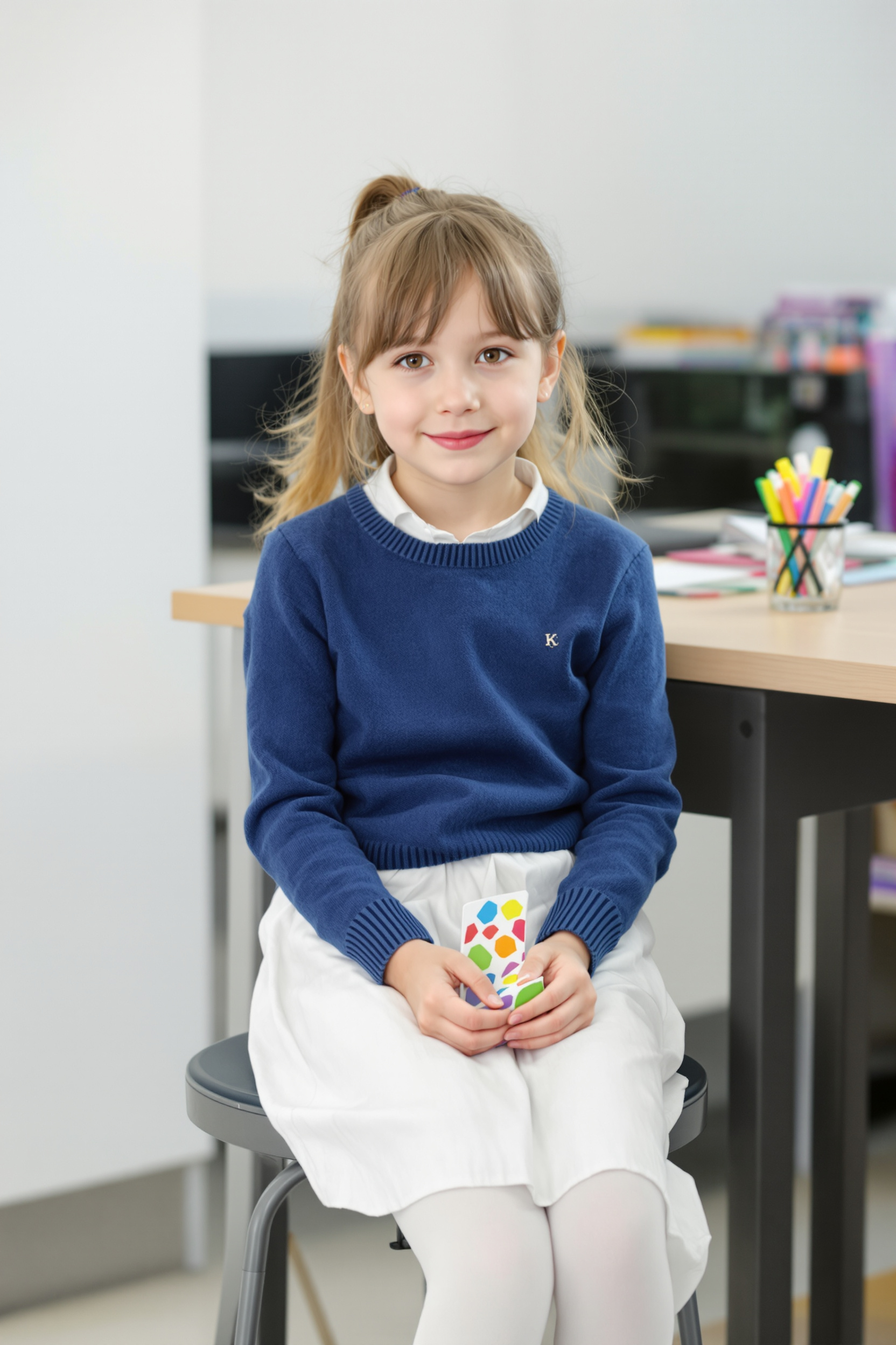 Девочка в голубом джемпере и белой юбке сидит на высокой табуретке у учительского стола, в руках держит цветные карточки, смотрит прямо в камеру, позади — минималистичный светлый класс, на столе стакан с маркерами.