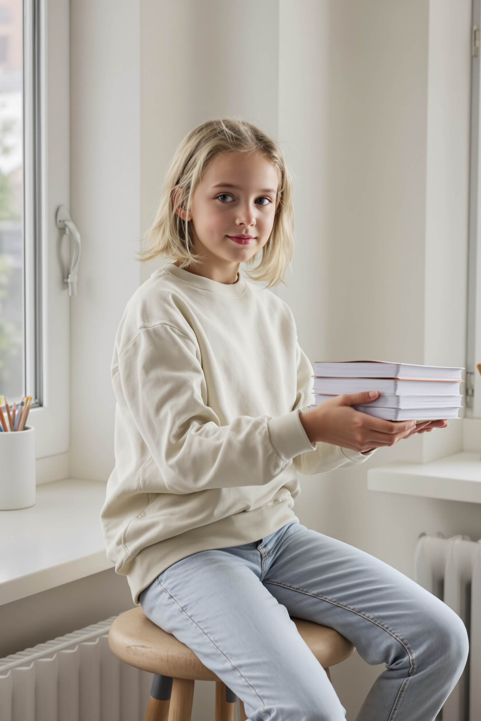 Девочка в кремовом свитшоте и светло-голубых джинсах сидит на высоком стуле у окна, расставляет тетради в стопку, смотрит прямо в камеру, минималистичный светлый школьный класс, на подоконнике только карандашница.