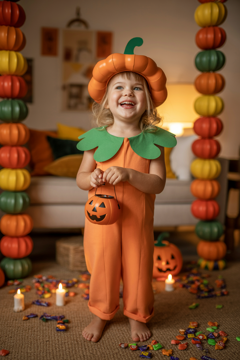 Девочка в просторной комнате с яркой гирляндой из бумажных тыкв, одета в классический образ хэллоуинской тыквы: оранжевый комбинезон с зелёным воротником, на голове зелёная шапочка-стебель, в руках держит игрушечный фонарь-тыкву, уверенно стоит и смотрит в камеру, вокруг разбросаны конфеты и маленькие свечки.