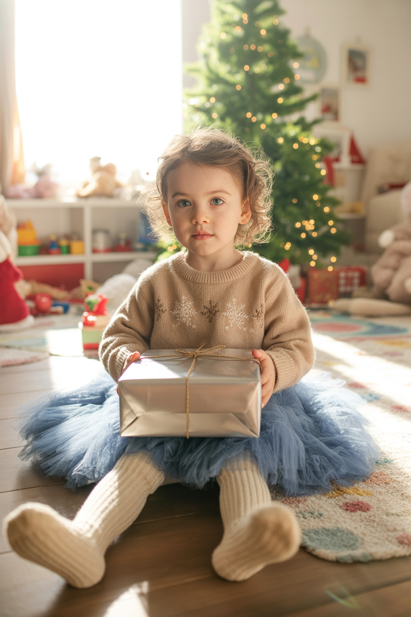 Девочка в просторной светлой игровой комнате рядом с ярко украшенной новогодней ёлкой, одета в уютный бежевый свитер с вышивкой снежинок, пушистую голубую юбку-солнце и кремовые вязаные гольфы. Она сидит на мягком ковре, оперевшись рукой на пол и обнимая большую коробку с подарком, внимательно смотрит в камеру, вокруг мерцают сказочные огоньки.
