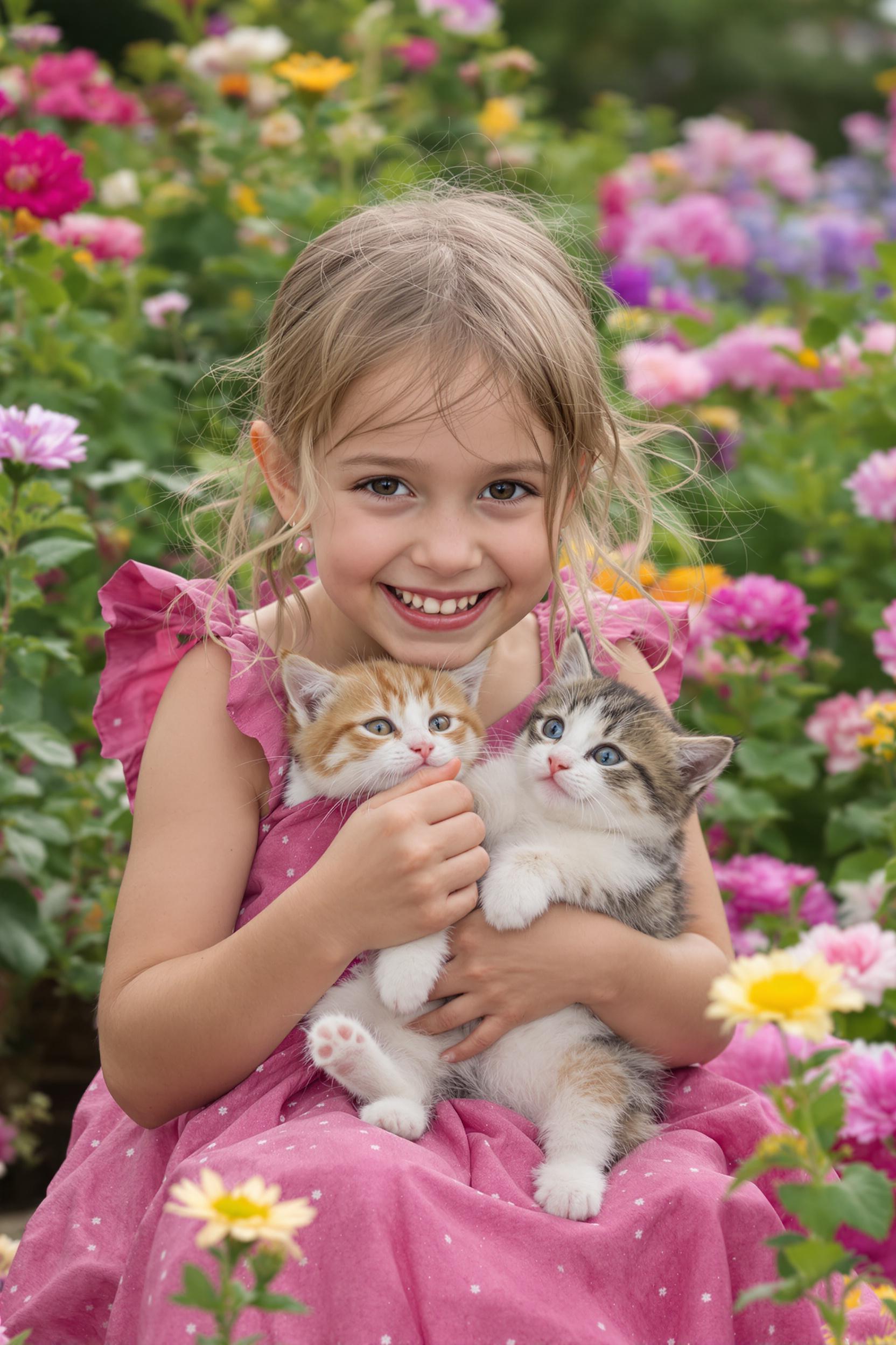 Девочка в розовом сарафане играет с котёнком в саду среди цветов. Она смеётся, глядя в камеру. Крупный план, живые эмоции и искренность.