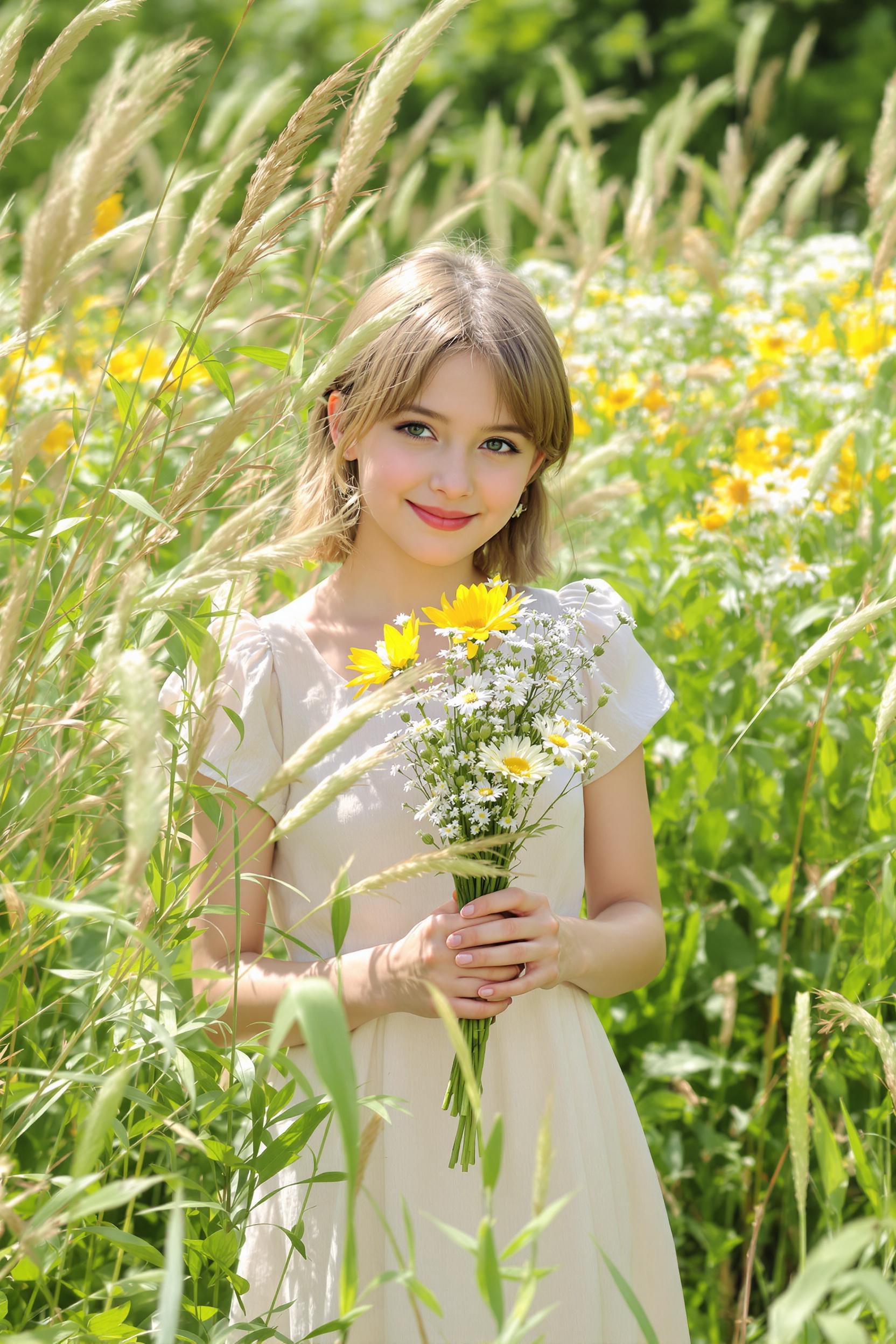 Девочка в светлом платье держит букет полевых цветов, стоя среди высокой травы на солнечной поляне. Она слегка улыбается и смотрит прямо в объектив. Крупный план, летняя атмосфера счастья.