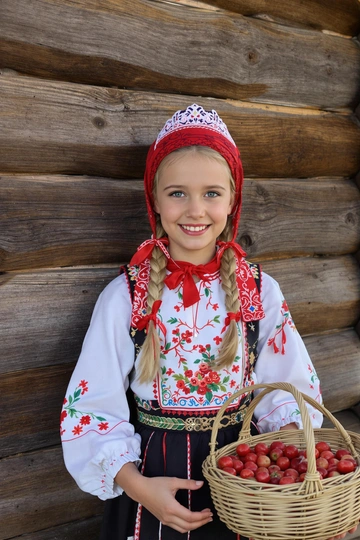 Девочка в традиционном русском сарафане с вышивкой и алом платке, заплетённые косички украшены ленточками. Она держит корзинку с ягодами, стоит на фоне деревянной избы и с доброй улыбкой смотрит прямо в камеру, акцент на лице и костюме.