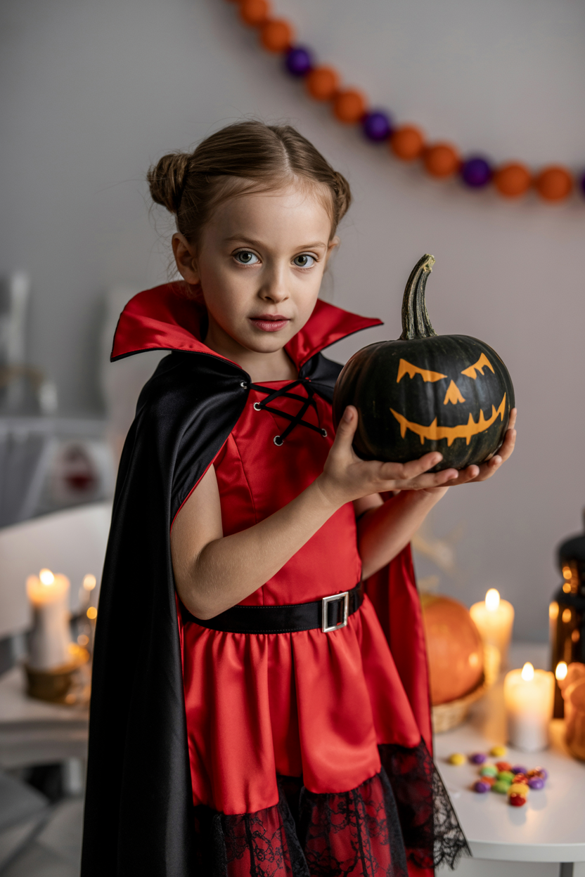 Девочка в украшенной оранжево-фиолетовыми гирляндами комнате, одета в костюм вампира: ярко-красное платье с чёрными кружевами, короткая накидка с заострённым воротником, пояс с серебряной пряжкой, держит в руках чёрную тыкву с нарисованной зловещей улыбкой, смотрит прямо в камеру, на фоне — свечи и конфеты.