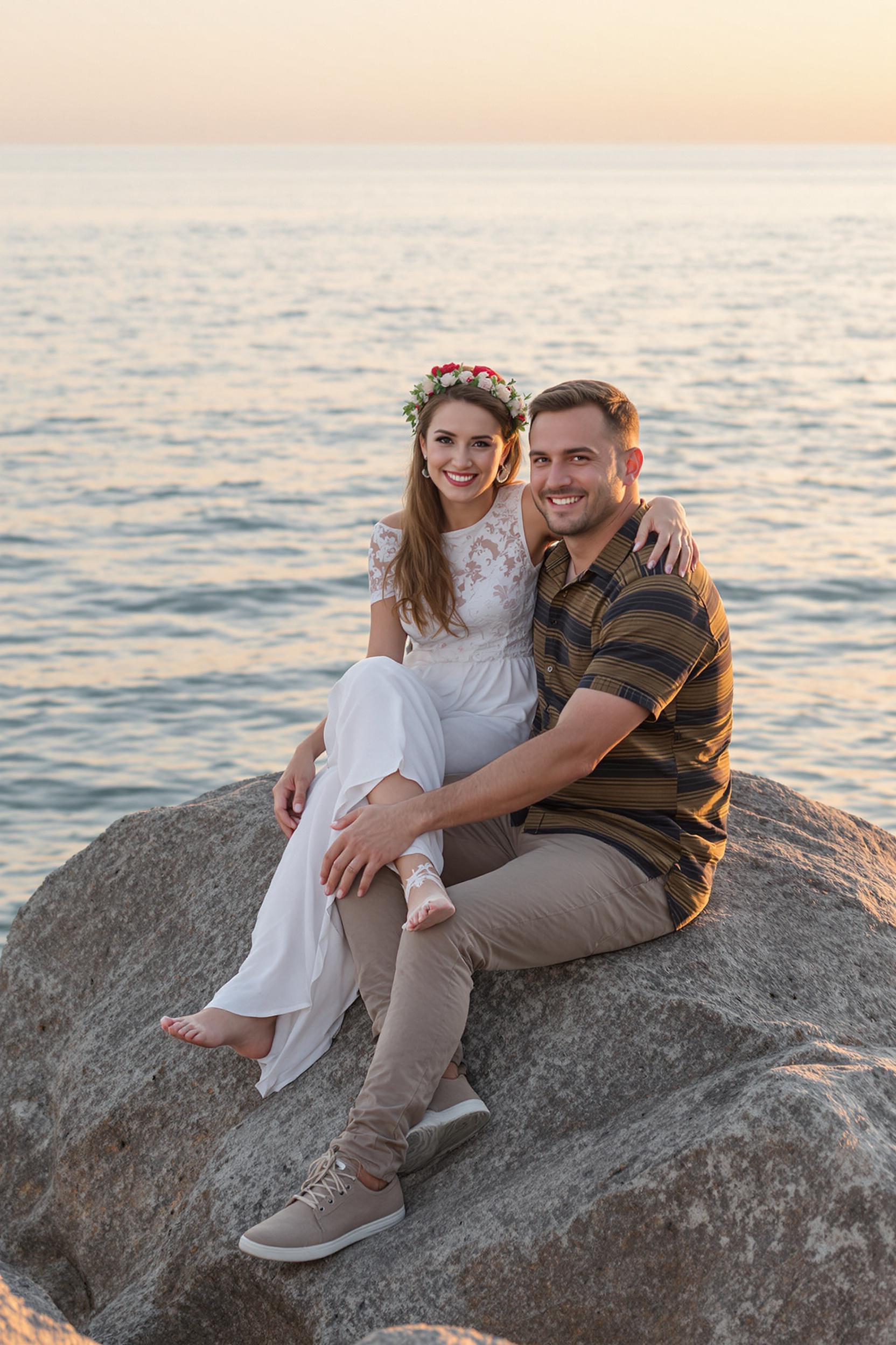 Девушка и парень сидят на берегу моря на большом камне, между ними тесный контакт – парень обнимает девушку за плечи, оба смотрят в камеру и улыбаются, за спиной спокойная морская гладь и мягкий свет заката, лёгкая романтическая атмосфера, крупный план.