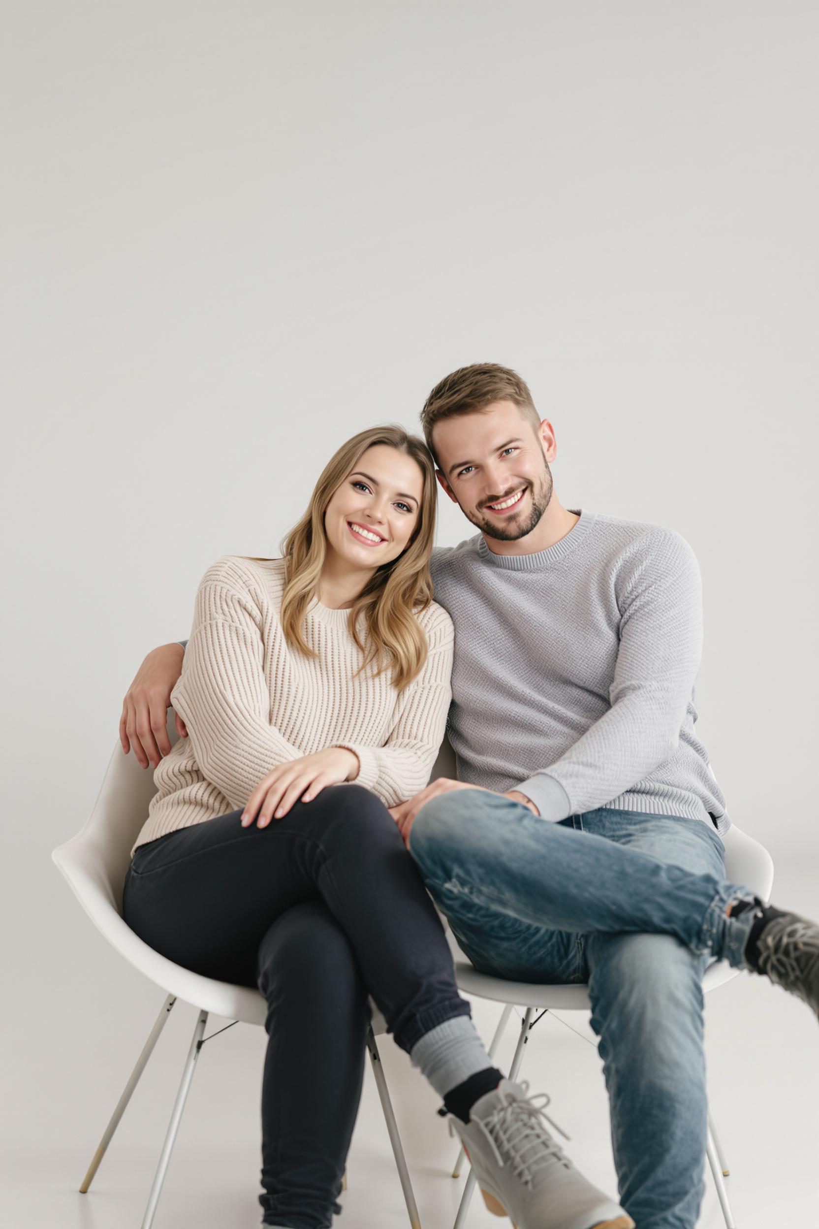 Девушка и парень сидят рядом на стильном минималистичном кресле в светлой студии, слегка наклонившись друг к другу, оба смотрят в камеру с мягкими улыбками, расслабленная поза, уютная атмосфера, нейтральный интерьер, естественный свет.