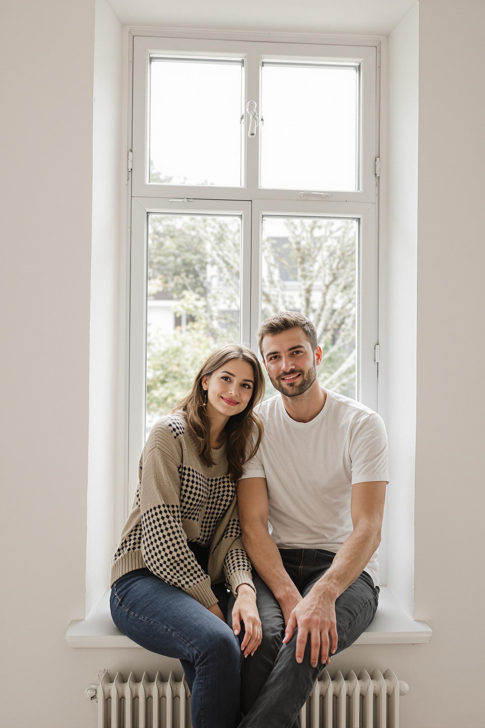 Девушка и парень сидят вместе на широком подоконнике в светлой минималистичной студии, оба смотрят в камеру с лёгкими улыбками, между ними ощущение спокойствия и близости, мягкое дневное освещение, уютная атмосфера, нейтральный интерьер.