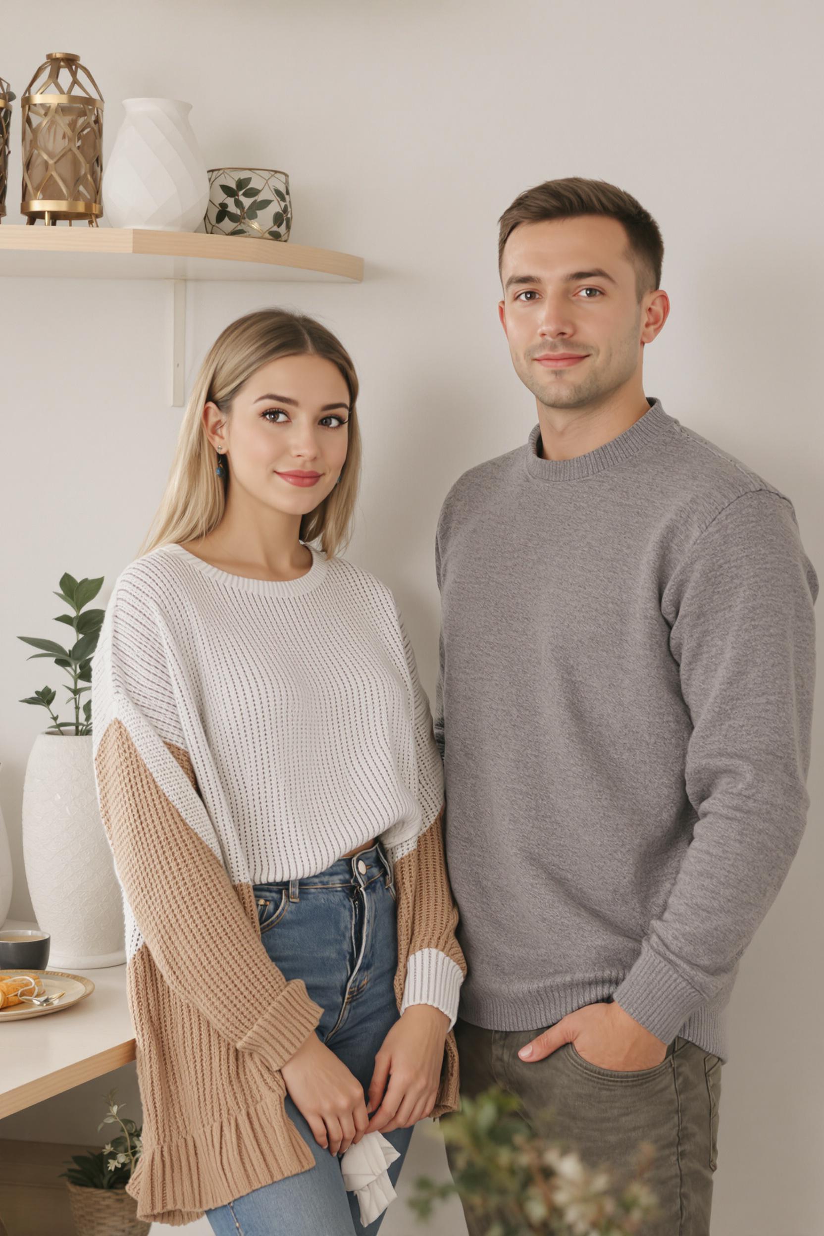 Девушка и парень стоят у невысокой полки с минималистичным декором в светлой уютной студии, оба смотрят прямо в камеру, на лицах лёгкие улыбки, их поза расслабленная, мягкий естественный свет, атмосфера спокойствия и гармонии.