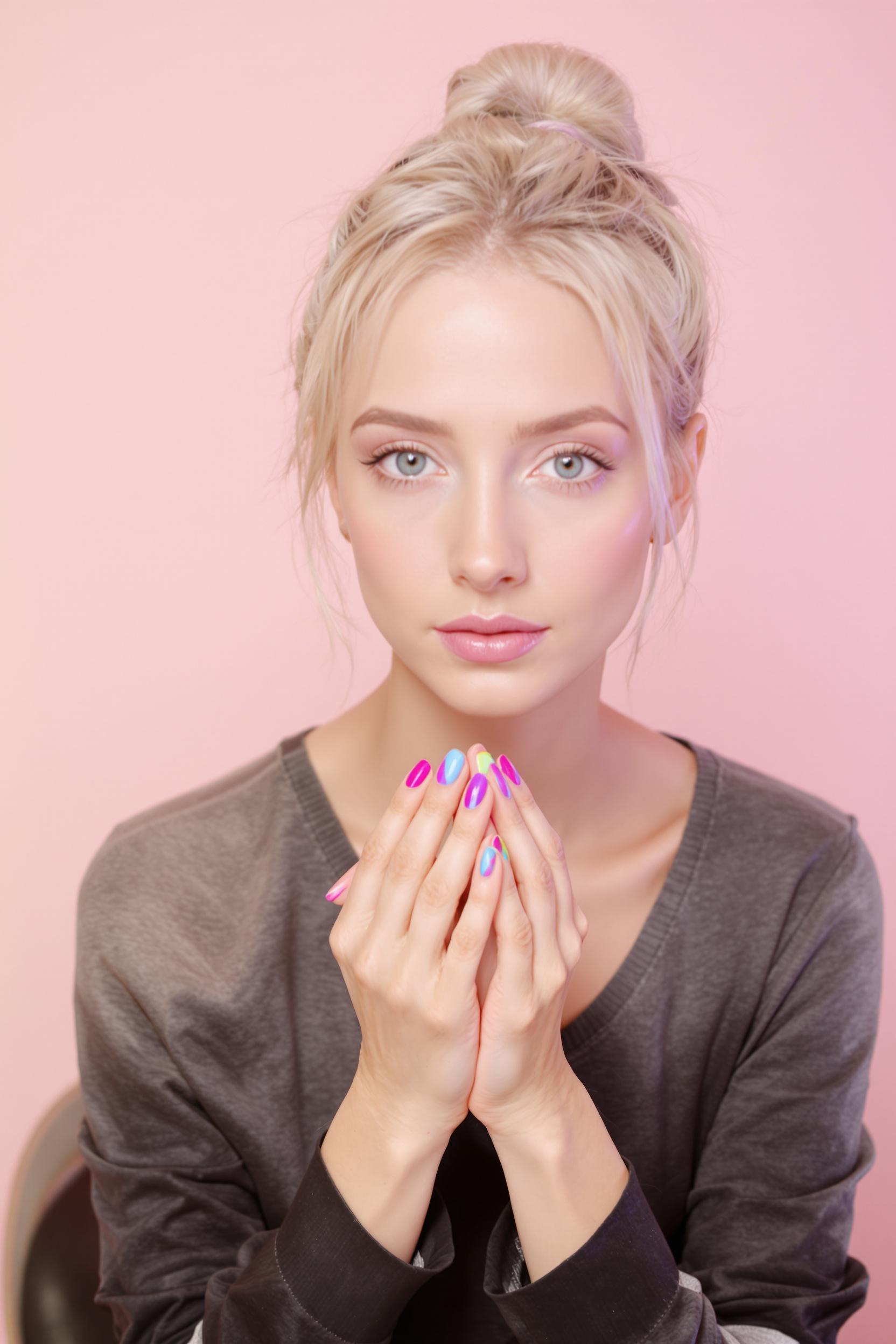 Девушка-мастер маникюра в лаконичном топе сидит на фоне нежного пастельного фона, средний план. Она смотрит прямо в камеру, кисти с разноцветным креативным нейл-артом изящно обрамляют нижнюю часть лица, акцент на свежем макияже и деталях ногтей.