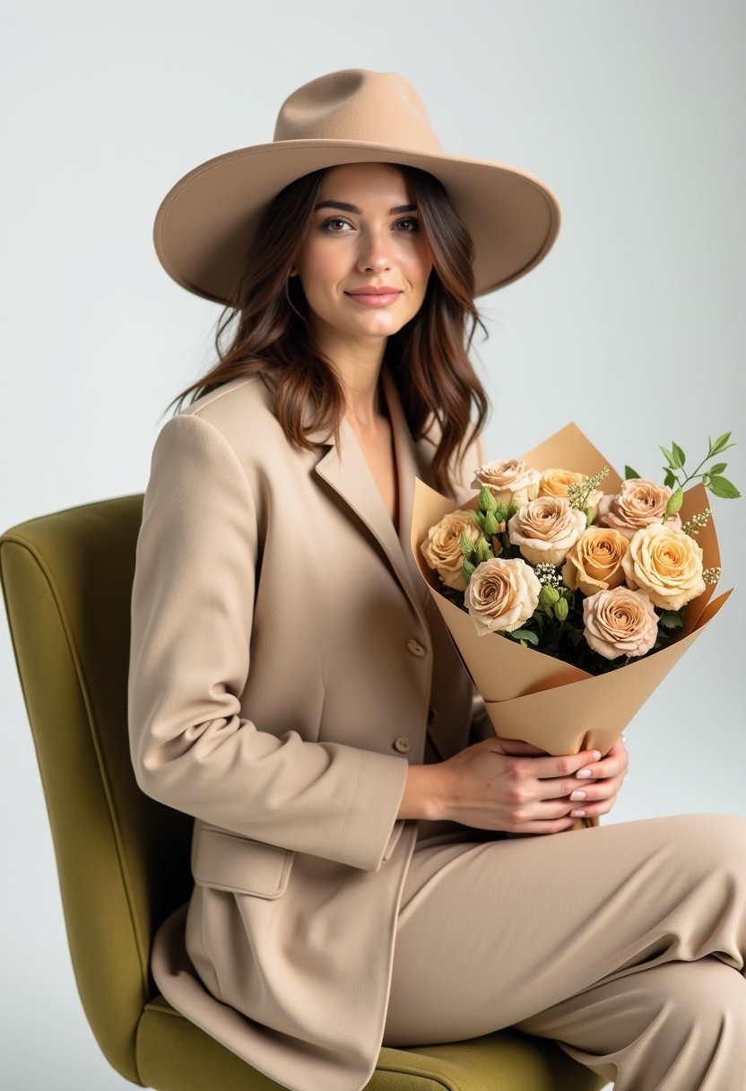 Девушка позирует на стуле с мягкой оливково-зеленой обивкой в фотостудии. Фон чисто белый. На ней бежевый оверсайз пиджак, фетровая широкополая шляпа в тон пиджака. В руках большой букет из разных цветов бежевых оттенков, обернутый в бежевую бумагу. Крупный план, фото сбоку