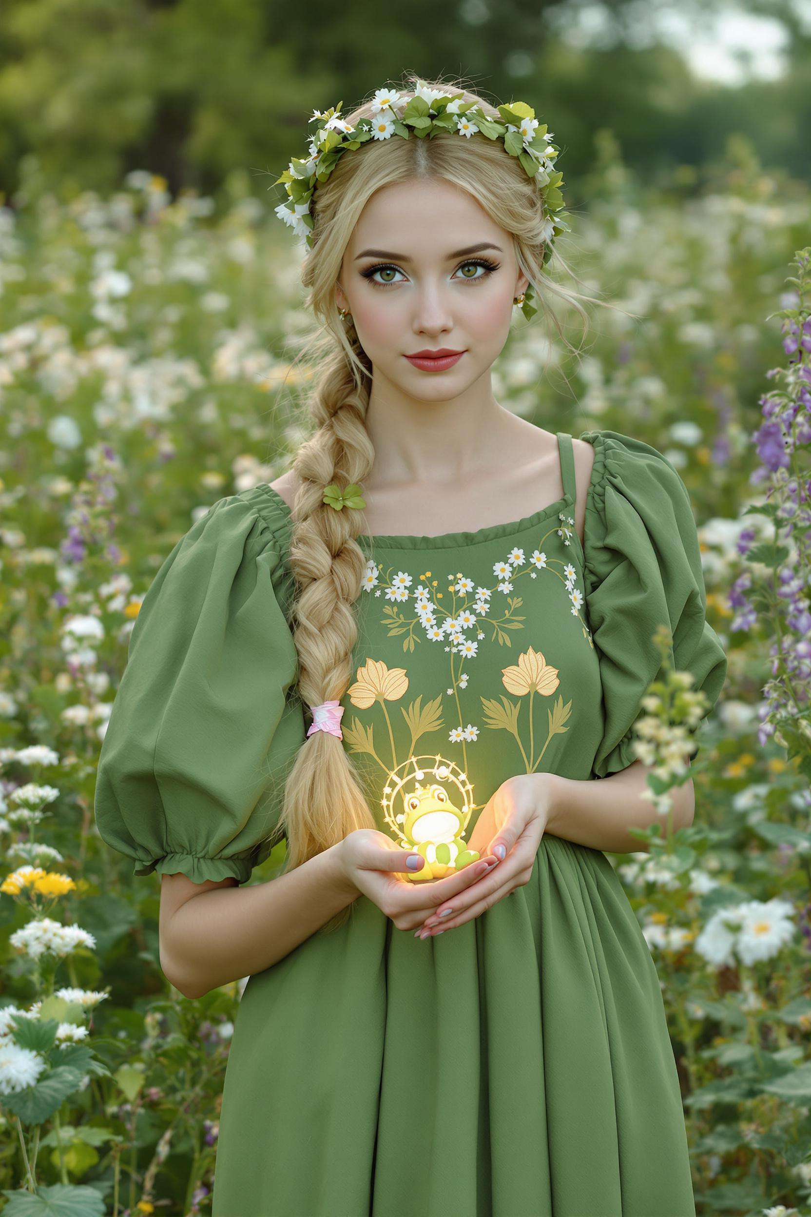 Девушка с длинной русой косой в зелёном сарафане с вышивкой ромашками и венке из клевера стоит на поле среди разнотравья, держит в руках светящуюся лягушку-царевну, позирует в полный рост, смотрит прямо в камеру, вокруг летняя сказочная природа.