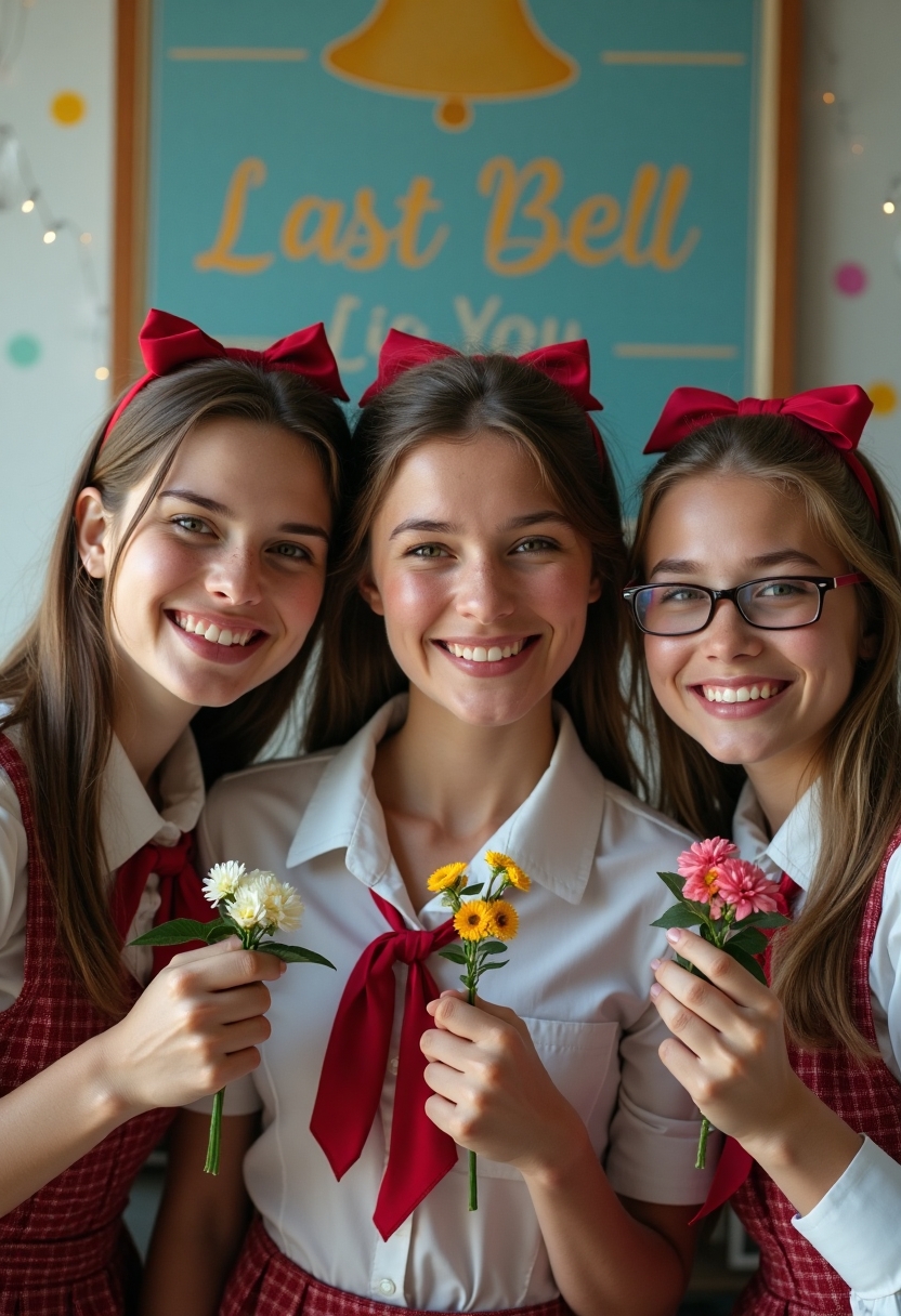 Девушка с двумя подругами в школьных формах позирует для фото на фоне плаката 'Последний звонок'. Все улыбаются, у каждой — цветы и банты. Крупный план, атмосфера дружбы и радости.