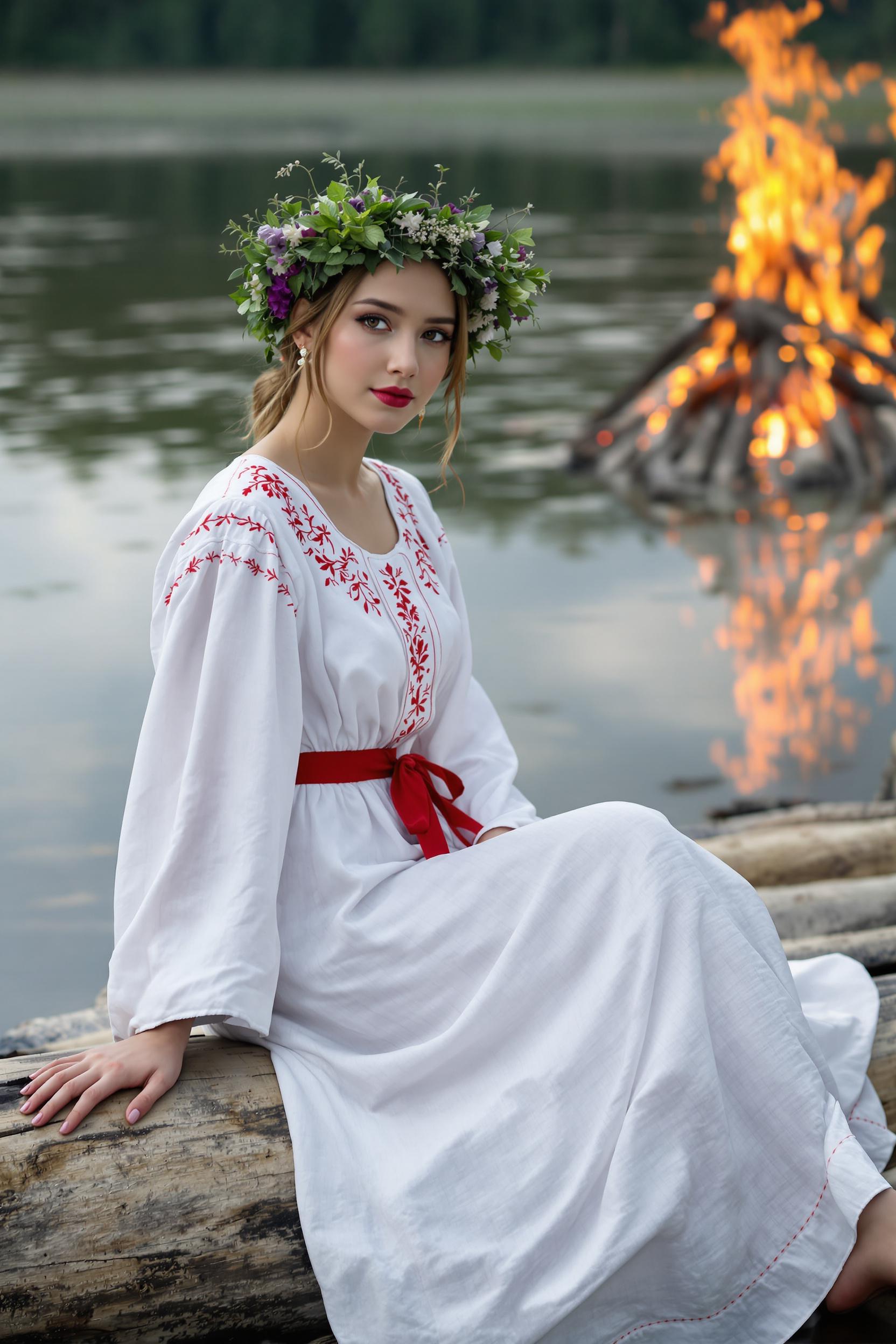 Девушка сидит на бревне у самого берега воды, на ней длинное белое хлопковое платье с широкими рукавами и тонкой вышивкой по вороту, по талии перевязан алой тесьмой. На голове пышный венок из разнотравья. Она смотрит в камеру, одной рукой опирается на бревно, вторая лежит на колене. Позади — высокий костёр и его отражение в воде.