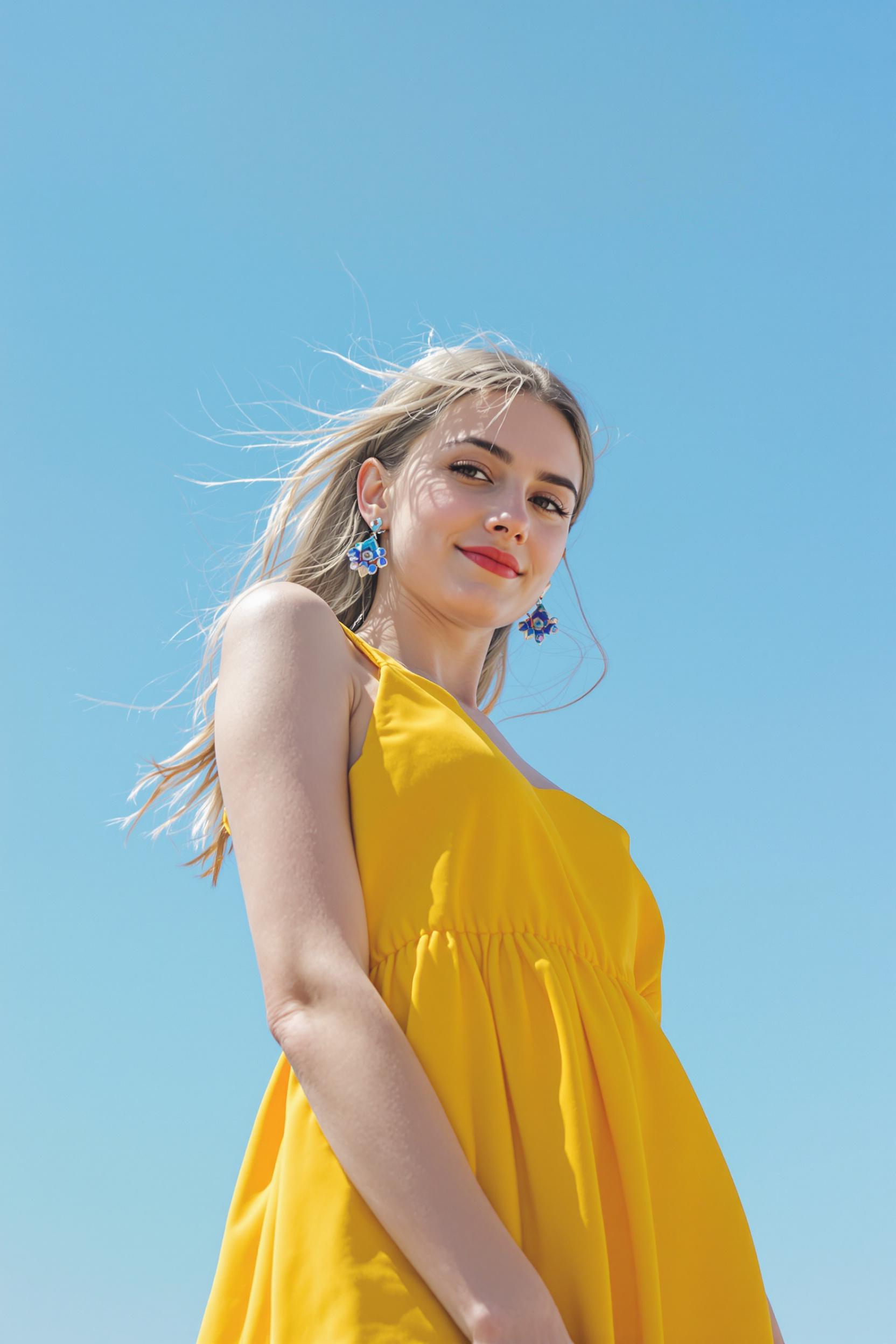 Девушка стоит на фоне голубого летнего неба, взгляд направлен прямо в камеру, одета в насыщенное жёлтое платье, вокруг минимализм — только небо и свет, лёгкая улыбка, ощущение свободы и тепла, летний вайб.