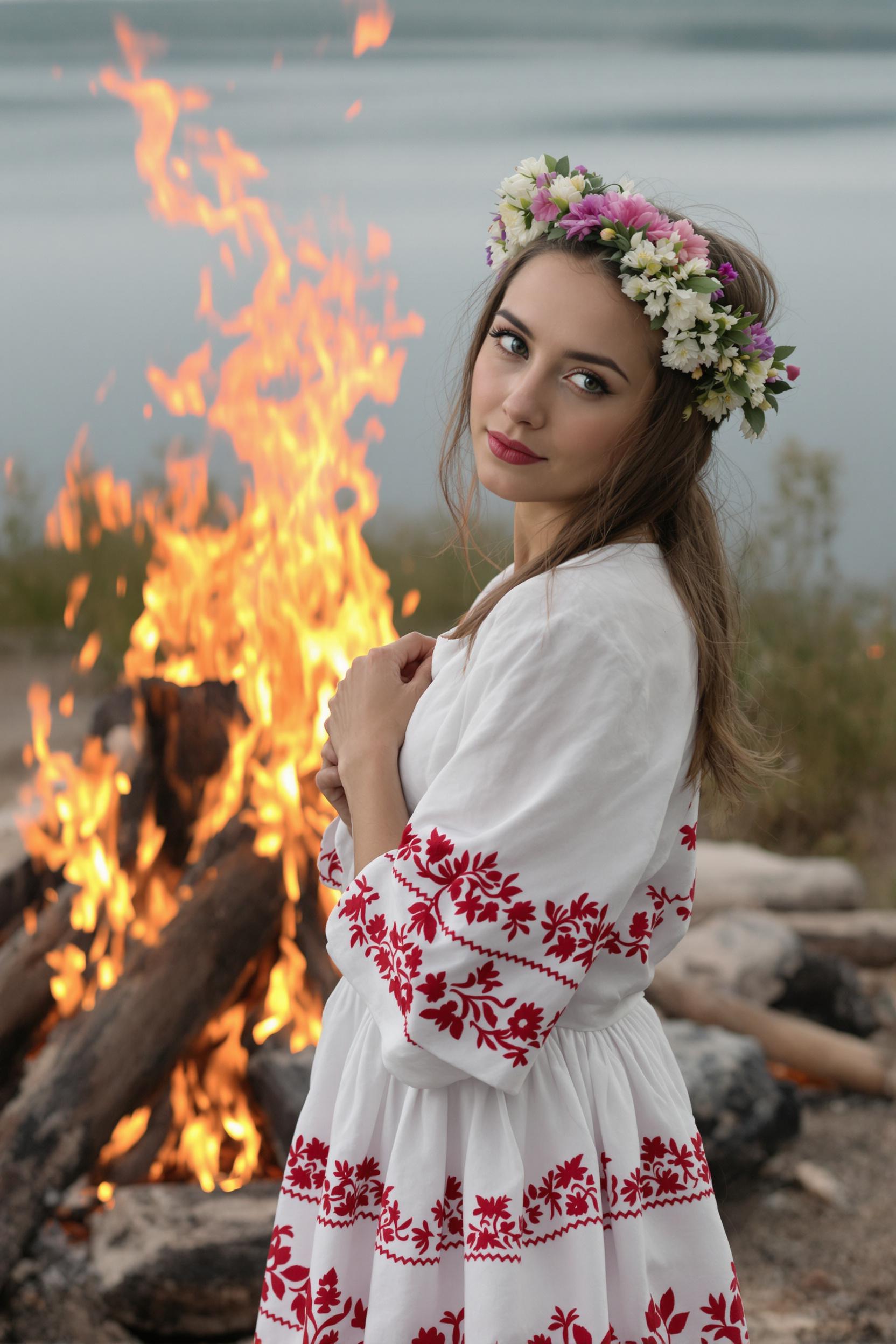 Девушка стоит спиной к тёплому костру, ближе к воде, на ней белое хлопковое платье с узором из красной вышивки по подолу и рукавам, венок из полевых цветов украшает её волосы. Она склонила голову к плечу, смотрит прямо в камеру, руки сложены на груди.