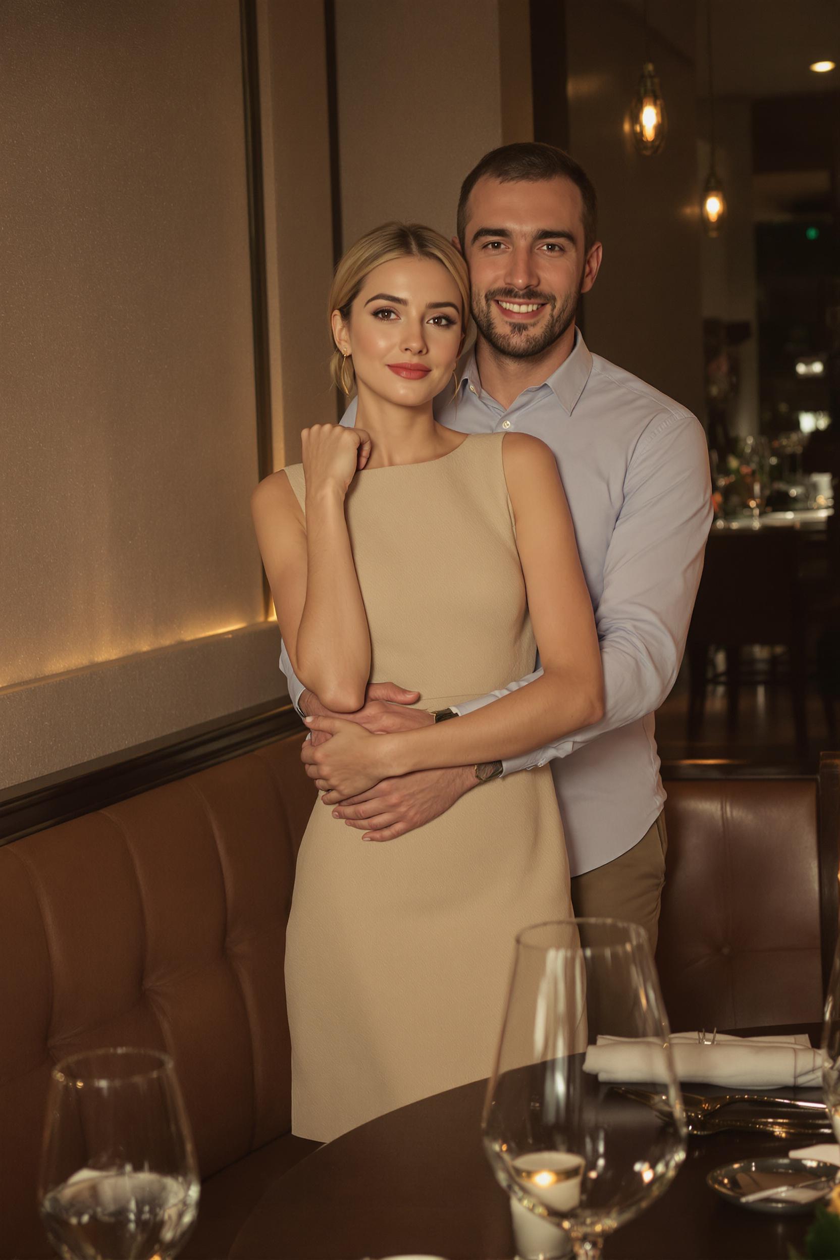 Девушка в аккуратном бежевом платье стоит у столика с сервированными бокалами в уютном ресторане, мужчина в рубашке нежно обнимает её сзади за талию, оба смотрят прямо в камеру, на лицах лёгкие улыбки, атмосфера романтики, средний план.