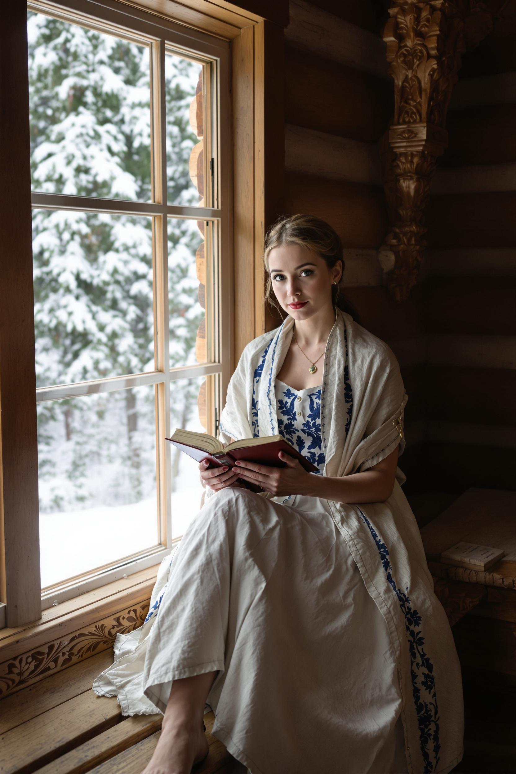 Девушка в белом сарафане с синими вставками и павлопосадским платком сидит на резной деревянной скамье у окна избы, держит в руках старинную книгу, смотрит прямо в камеру, за окном снежный лес, в помещении царит уютный полумрак.